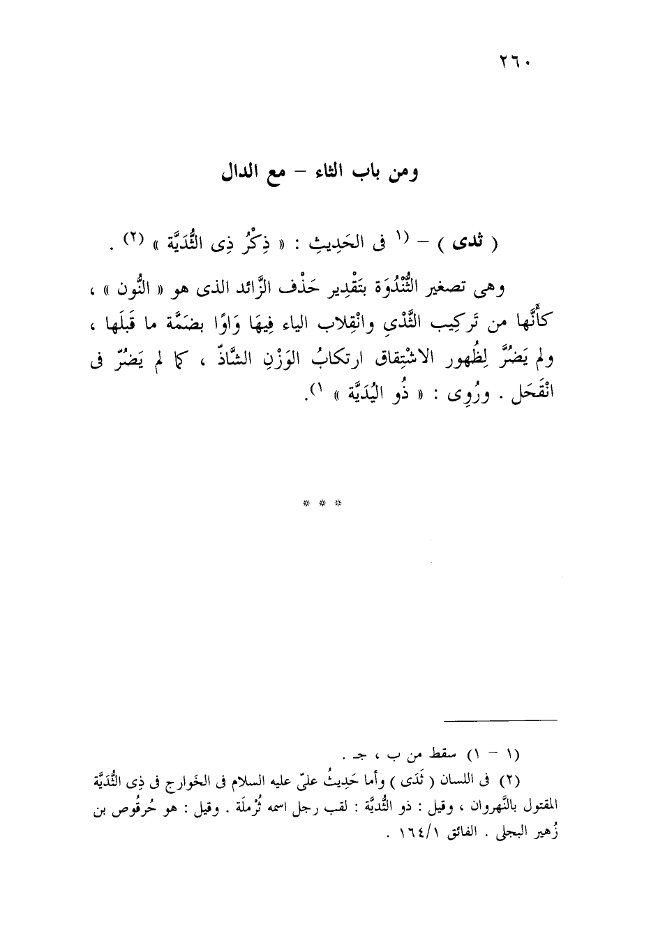 (¬2) في اللسان (ثَدَى) وأما حَدِيثُ عليّ عليه السلام في الخَوارج في ذِي الثُّدَيَّة المقتول بالنَّهروان، وقيل: ذو الثُّديَّة: لقب رجل اسمه ثُرْملَة. وقيل: هو حُرقُوص بن زُهير البَجَليّ. الفائق 1/ 164.