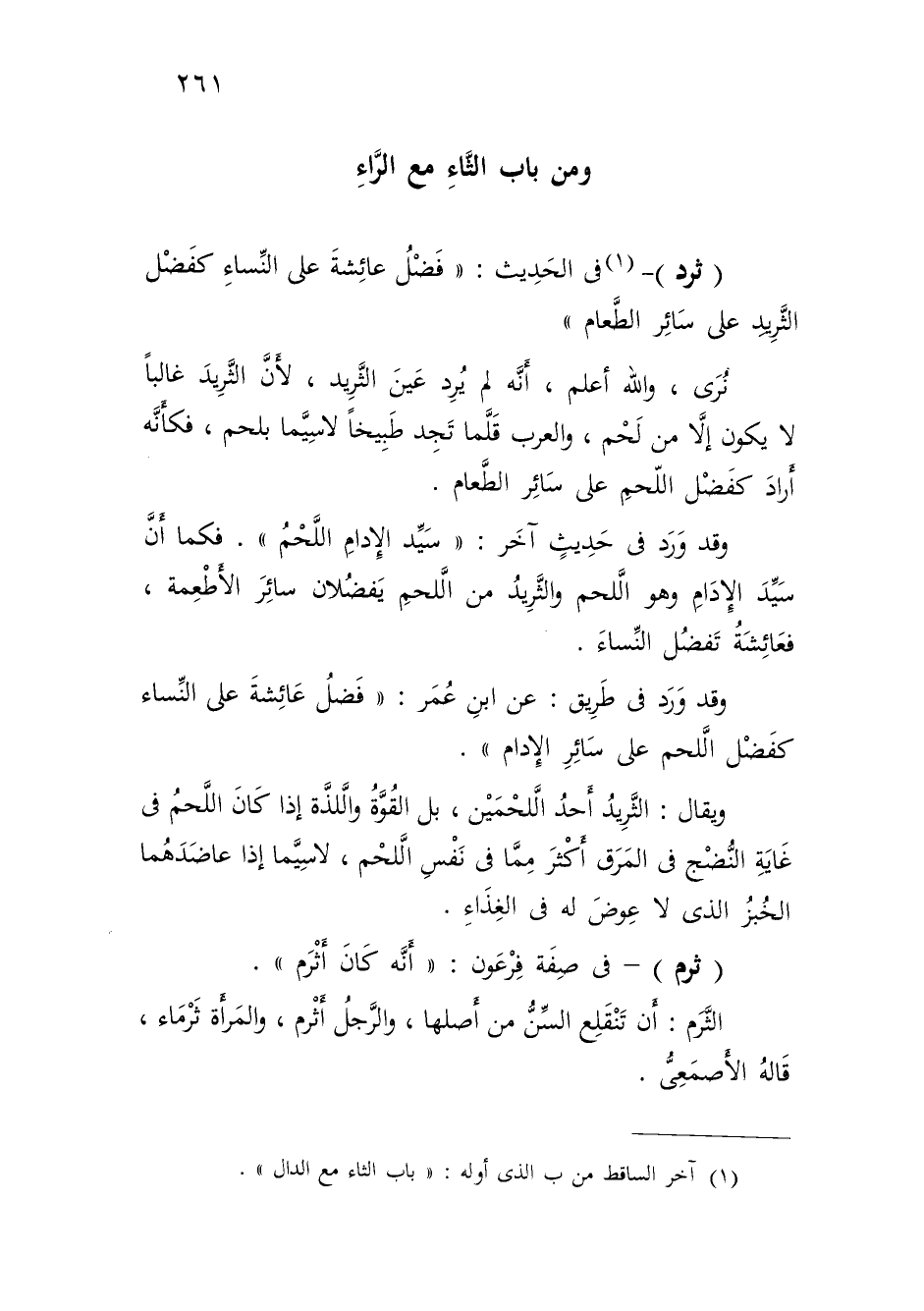 ويقال: الثَّرِيدُ أَحدُ الَّلحْمَيْن، بل القُوَّةُ والَّلذَّة إذا كَانَ اللَّحمُ في غَايَةِ النُّضْج في المَرَق أَكْثرَ مِمَّا في نَفْسِ الَّلحْم، لا سِيَّما إذا عاضَدَهُما الخُبزُ الذي لا عِوضَ له في الغِذَاءِ.