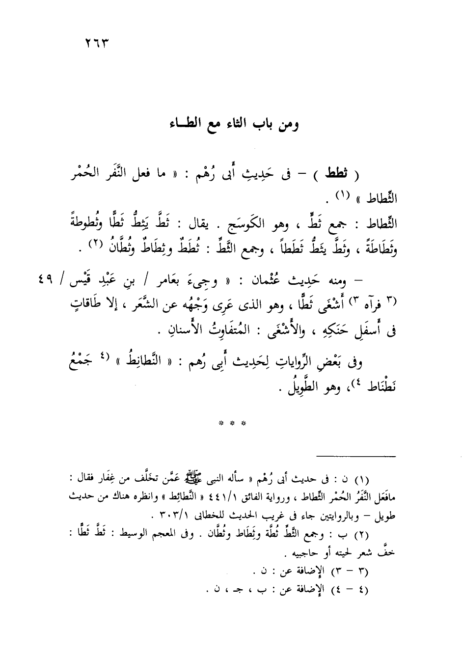 (¬1) ن: في حديث أبي رُهْم "سأله النَّبِيّ - صلى الله عليه وسلم - عَمَّن تخَلَّف من غِفَار فقال: ما فَعَل النَّفَرُ الحُمْر الثِّطاط، ورواية الفائق 1/ 441 "النَّطائِط" وانظره هناك من حديث طويل - وبالروايتين جاء في غريب الحديث للخطابي 1/ 303.