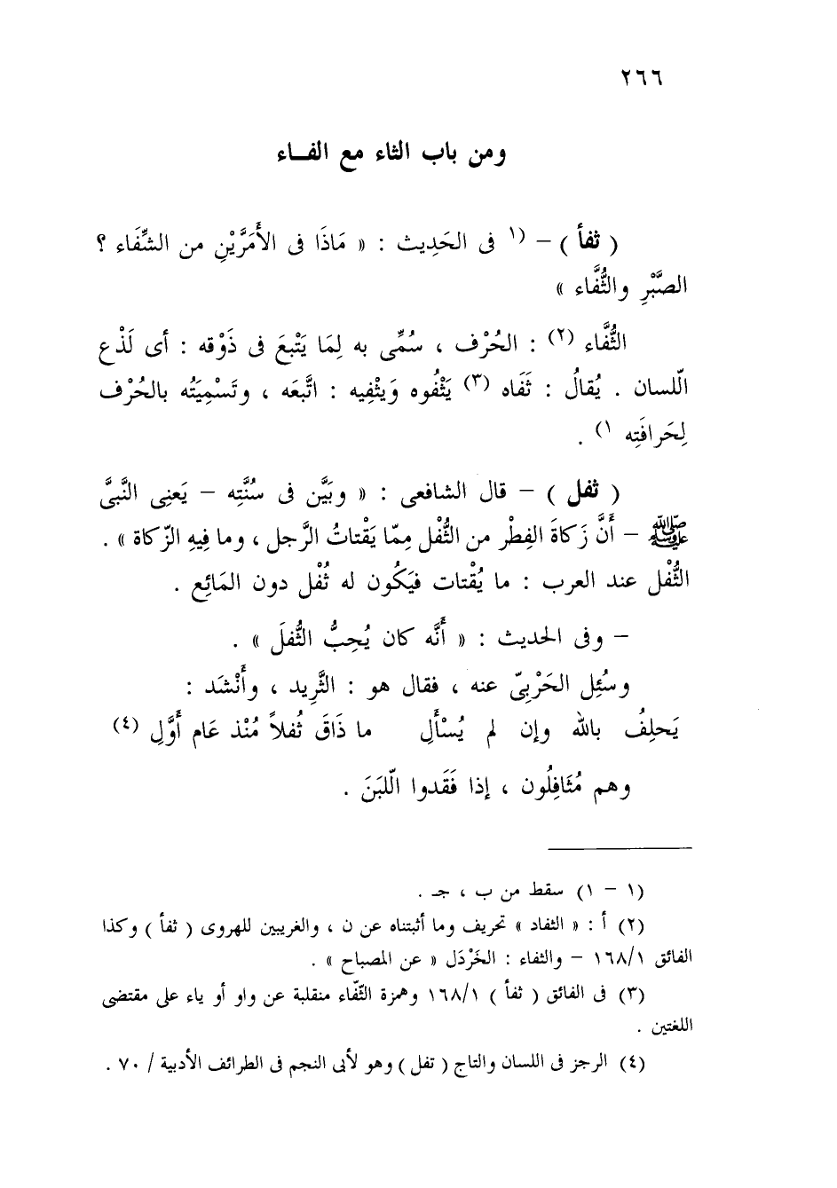 (¬3) في الفائق (ثفأ) 1/ 168 وهمزة الثّفّاء منقلبة عن واو أو ياء على مقتضى اللغتين.