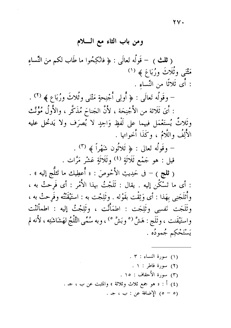: أي ثَلَاثة من الأَجْنِحَة، لأَنَّ الجَناحَ مُذَكَّر، والأولُ مُؤنَّث وثَلاثٌ يُستَعْمَل فيهما على لَفْظٍ وَاحِدٍ لا يُصرَف ولا يَدخُل عليه الأَلِفُ واللَّامُ، وكَذَا أَخَواتها.