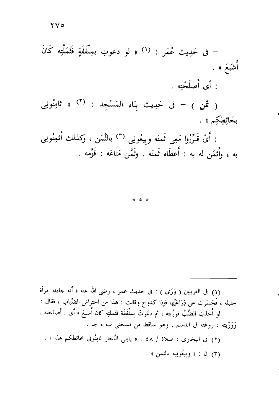 (¬1) في الغريبين (وَرَى): في حديث عمر، رضي الله عنه "أنَّه جاءته امرأة جليلة، فَحَسَرت عن ذِرَاعَيْها فإذا كدوح وقالت: هذا من احتراش الضِّباب، فقال: لو أَخذتِ الضَّبَّ فورَّيته، ثم دعَوتْ بِملْفَفَة فثَملتِه كان أَشبعَ" أي: أصلحته. وَوَرّيته: روغته في الدسم. وهو ساقط من نسختي ب، جـ.