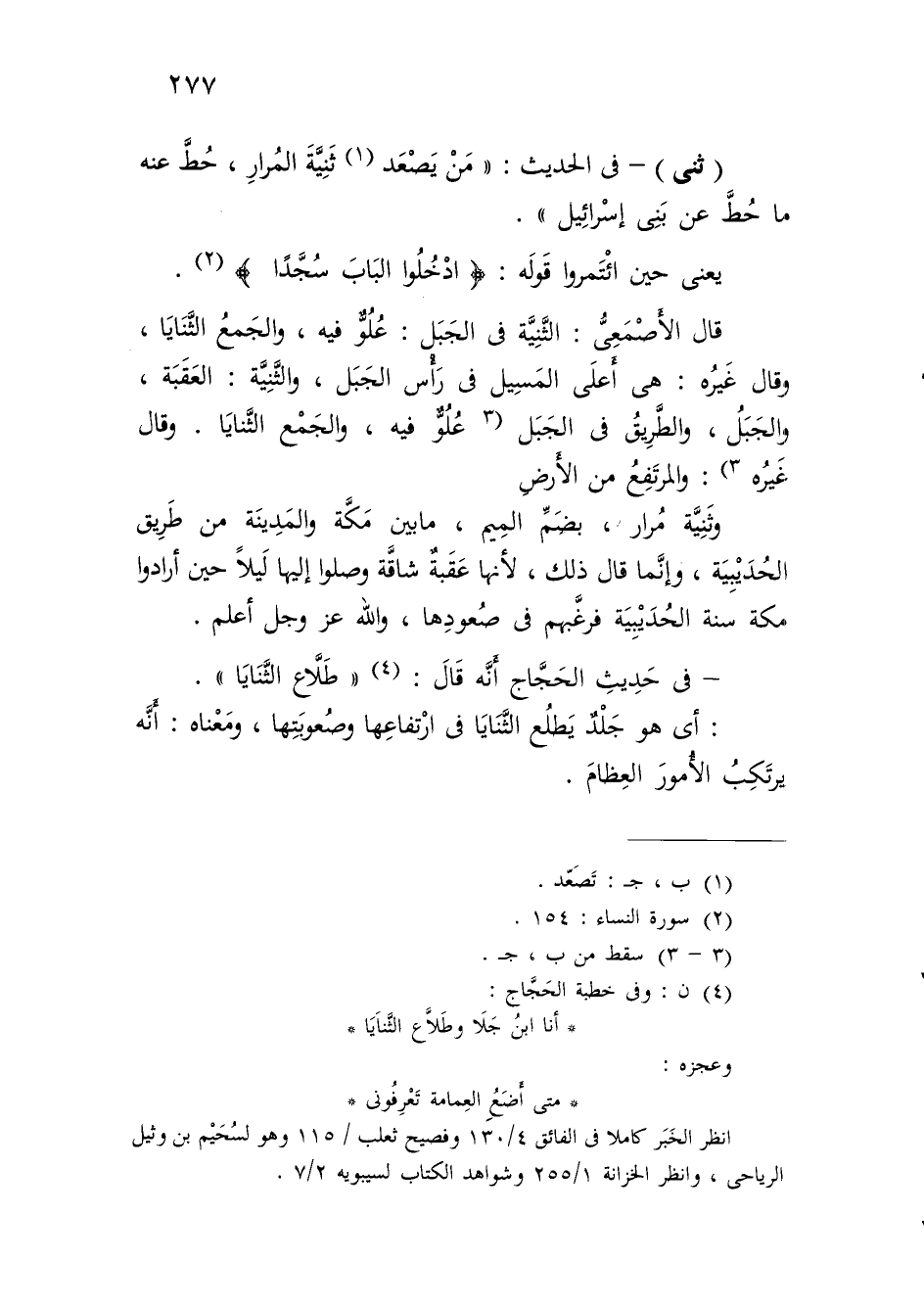 (ثنى) - في الحديث: "مَنْ يَصْعَد (¬1) ثَنِيَّةَ المُرارِ، حُطَّ عنه ما حُطَّ عن بَنِي إسْرائِيل".