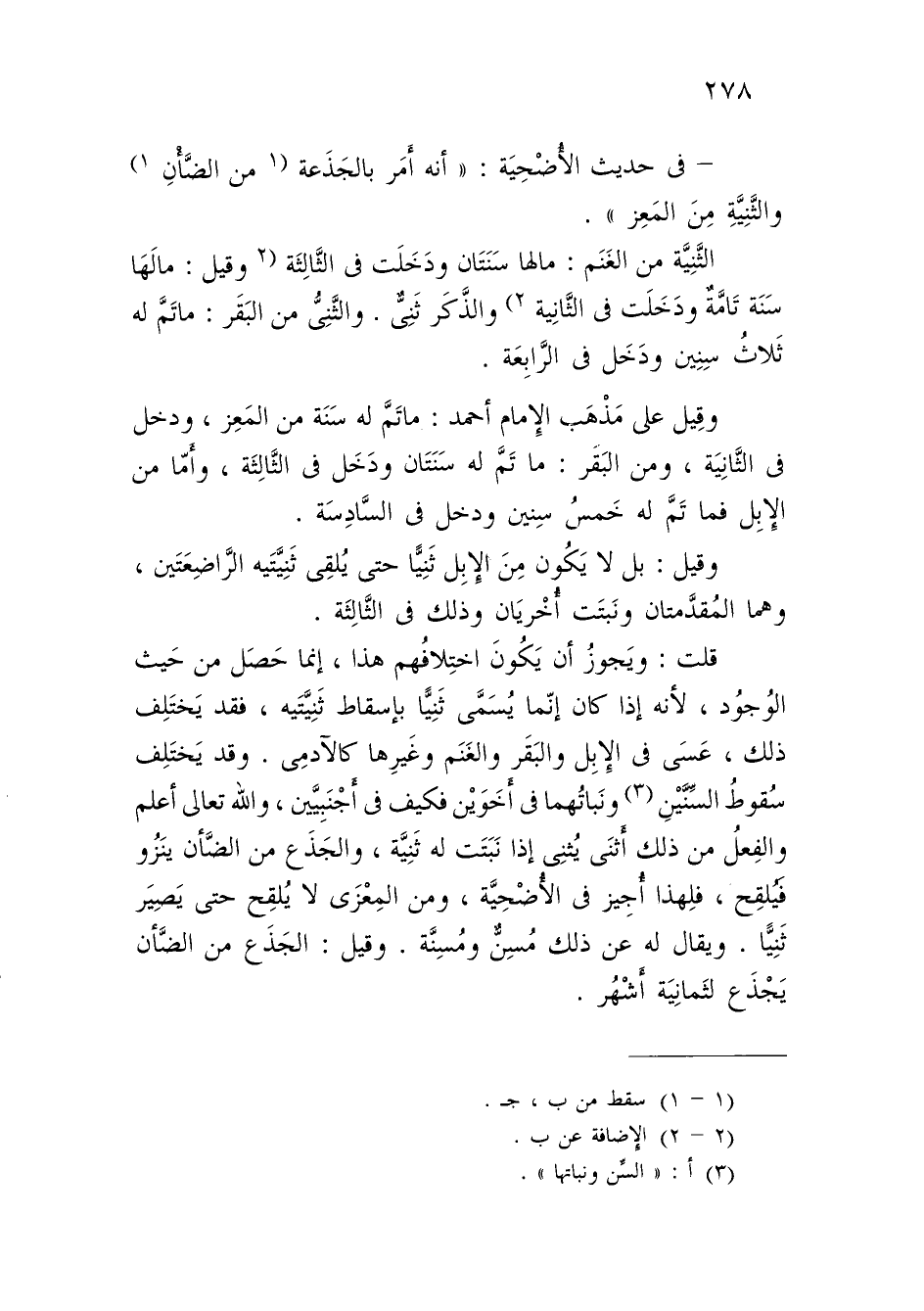 قلت: ويَجوزُ أن يَكُونَ اختِلافُهم هذا، إنما حَصَل من حَيث الوُجوُد، لأنه إذا كان إنَّما يُسَمَّى ثَنِيًّا بإسقاط ثَنِيَّتَيه، فقد يَختَلِف ذلك، عَسَى في الِإبِل والبَقَر والغَنَم وغَيرِها كالآدمِي. وقد يَختَلِف سُقوطُ السِّنَّيْنِ (¬3) ونَباتُهما في أَخَوَيْن فكيف في أَجْنَبِيَّين، والله تعالى أعلم والفِعلُ من ذلك أَثنَى يُثنِي إذا نَبَتَت له ثَنِيَّة، والجَذَع من الضَّأن ينَزُو فَيُلقِح، فلِهذا أُجِيز في الأُضْحِيَّة، ومن المِعْزَى لا يُلقِح حتَّى يَصِيَر ثَنِيًّا. ويقال له عن ذلك مُسِنٌّ ومُسِنَّة. وقيل: الجَذَع من الضَّأن يَجْذَع لثَمانِيَة أَشْهُر.