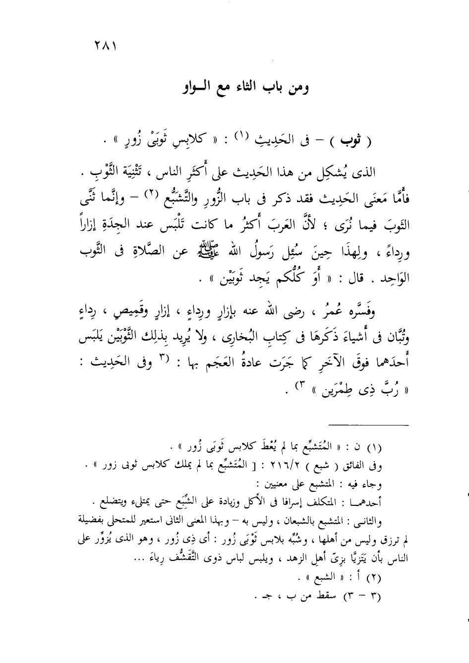 والثاني: المتشبع بالشبعان، وليس به - وبهذا المعنى الثاني استعير للمتحلى بفضيلة لم ترزق وليس من أهلها، وشُبِّه بلابس ثَوْبَى زُور: أي ذِي زُور، وهو الذي يُزوِّر على النَّاس بأن يَتَزيَّا بزِيّ أهلِ الزهد، ويلبس لباس ذوى التَّقَشُّف رِياءَ ...