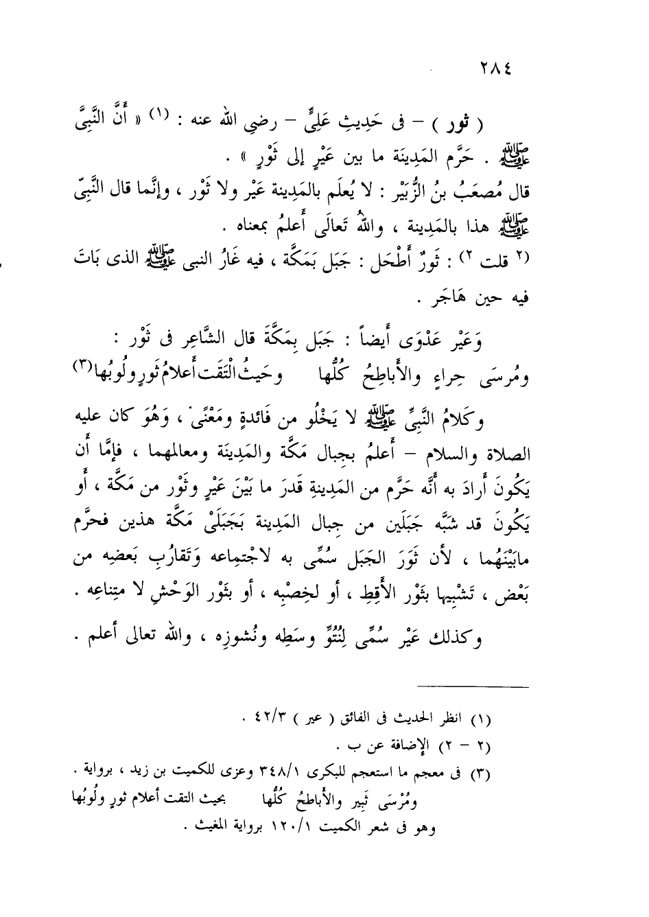 وكَلامُ النَّبِيِّ - صلى الله عليه وسلم - لا يَخْلُو من فَائدةٍ ومَعنًى، وَهُوَ كان عليه الصلاة والسلام - أَعلمُ بجِبال مَكَّة والمَدِينَة ومعالمهما، فإمَّا أَن يَكُونَ أَرادَ به أنَّه حَرَّم من المَدِينةِ قَدرَ ما بَيْنَ عَيْرٍ وثَوْر من مَكَّة، أو يَكُونَ قد شَبَّه جَبَلَين من جِبال المَدِينة بَجَبَلَيْ مَكَّة هذين فحرَّم ما بَيْنَهُما، لأن ثَوَرَ الجَبَل سُمِّي به لاجْتمِاعه وَتَقارُبِ بَعضِه من بَعْض، تَشْبِيها بثَوْر الأَقِطِ، أو لخِصْبِه، أو بثَوْر الوَحْشِ لامتِناعِه.