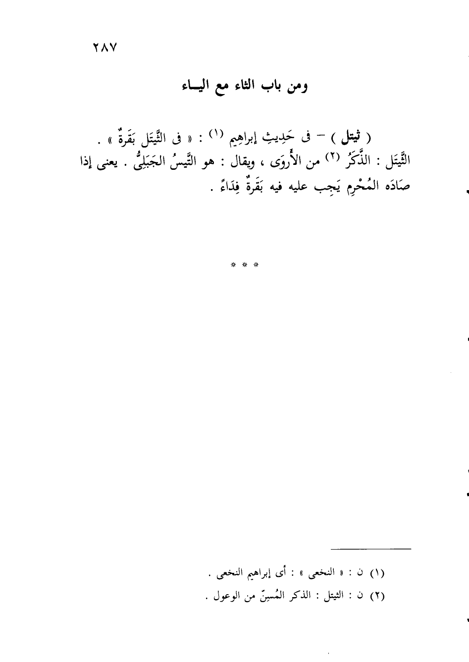 الثَّيتَل: الذَّكَرُ (¬2) من الأَروَى، ويقال: هو التَّيسُ الجَبَلِيُّ. يعنى إذا صَادَه المُحْرِم يَجِب عليه فيه بَقَرةٌ فِدَاءً.