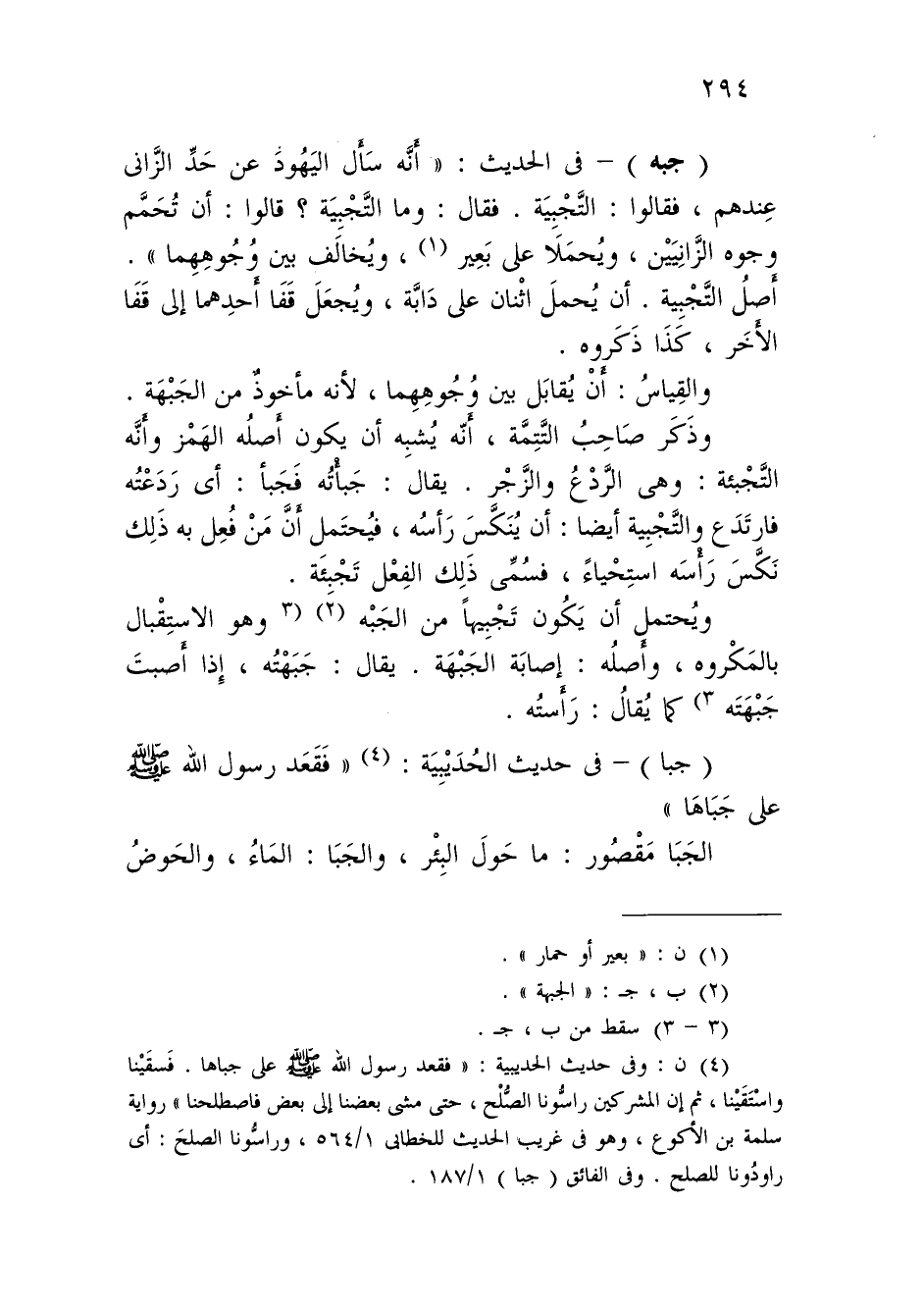 (جبه) - في الحديث: "أَنَّه سَأَل اليَهُودَ عن حَدِّ الزَّاني عِندهم، فقالوا: التَّجْبِيَة. فقال: وما التَّجْبِيَة؟ قالوا: أن تُحَمَّم وجوه الزَّانِيَيْن، ويُحمَلَا على بَعِير (¬1)، ويُخالَف بين وُجُوهِهِما".