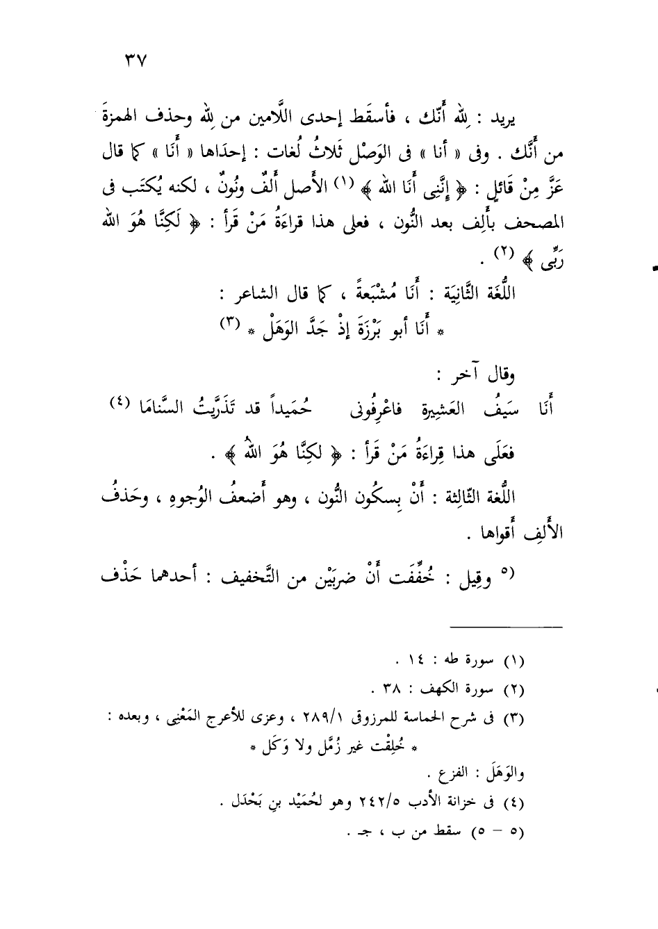 يريد: لله أنّك، فأسقَط إحدى اللَّامين من لله وحذف الهمزةَ من أَنَّك. وفي "أنا" في الوَصْل ثَلاثُ لُغات: إحدَاها "أَنَا" كما قال عَزَّ مِنْ قَائلٍ: {إِنَّنِي أَنَا اللَّهُ} (¬1) الأَصل أَلفٌ ونُونٌ، لكنه يُكتَب في المصحف بأَلِف بعد النُّون، فعلى هذا قراءَةُ مَنْ قَرأ: {لَكِنَّا هُوَ اللَّهُ رَبِّي} (¬2).
