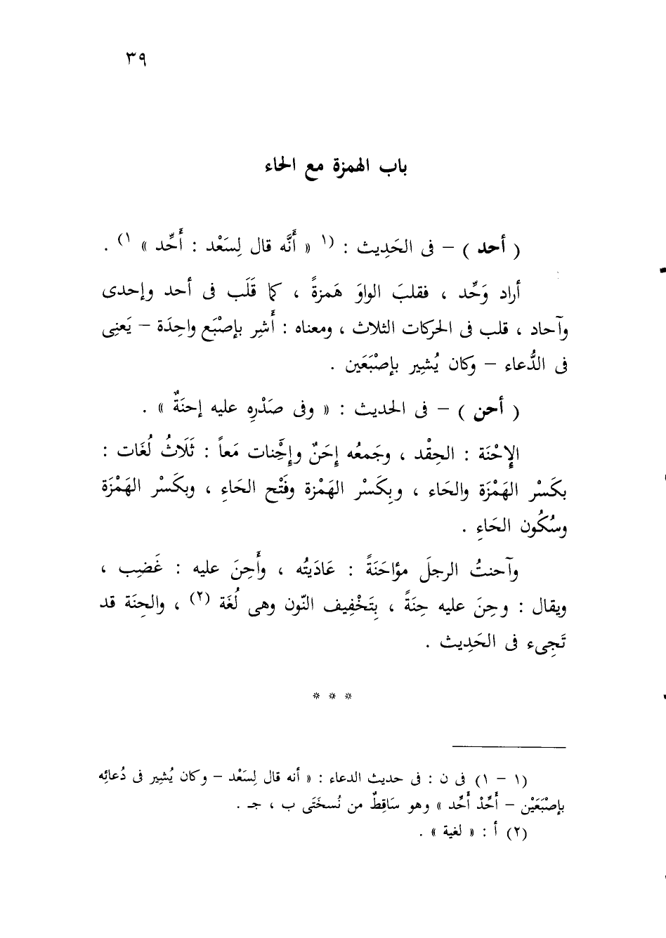 (1 - 1) في ن: في حديث الدعاء: "أنه قال لِسَعْد - وكان يُشِير في دُعائِه بإصْبَعَيْن - أَحِّدْ أَحِّد" وهو سَاقِطٌ من نُسخَتَى ب، جـ.