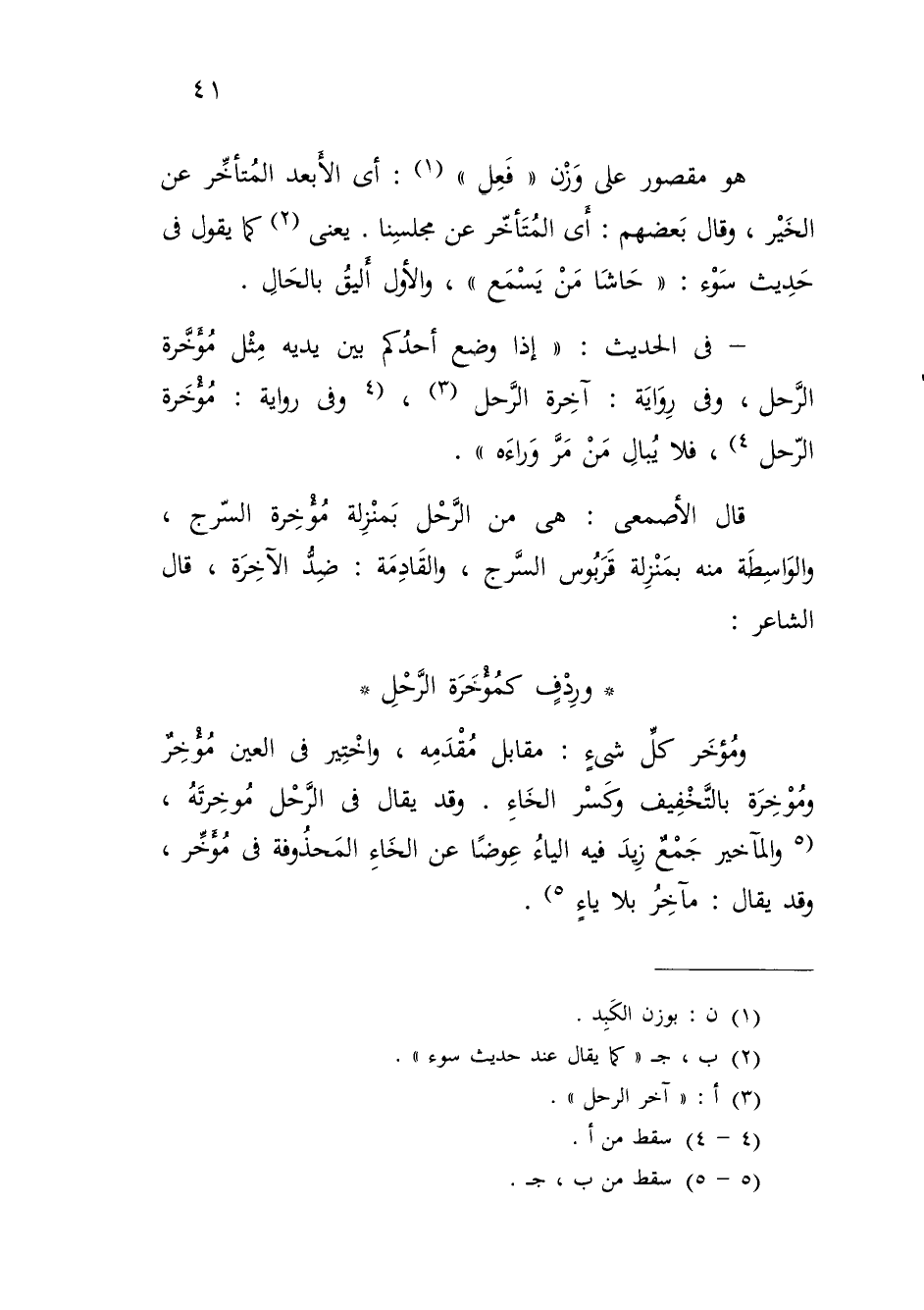 ومُؤخَر كلِّ شىءٍ: مقابل مُقْدَمِه، واخْتِير في العين مُؤْخِرٌ ومُوْخِرَة بالتَّخْفِيف كسْر الخَاءِ. وقد يقال في الرَّحْل مُوخِرتَهُ، (5 والمآخير جَمْعٌ زِيدَ فيه الياءُ عِوضًا عن الخَاءِ المَحذُوفة في مُؤَخِّر، وقد يقال: مآخِرُ بلا ياءٍ 5).