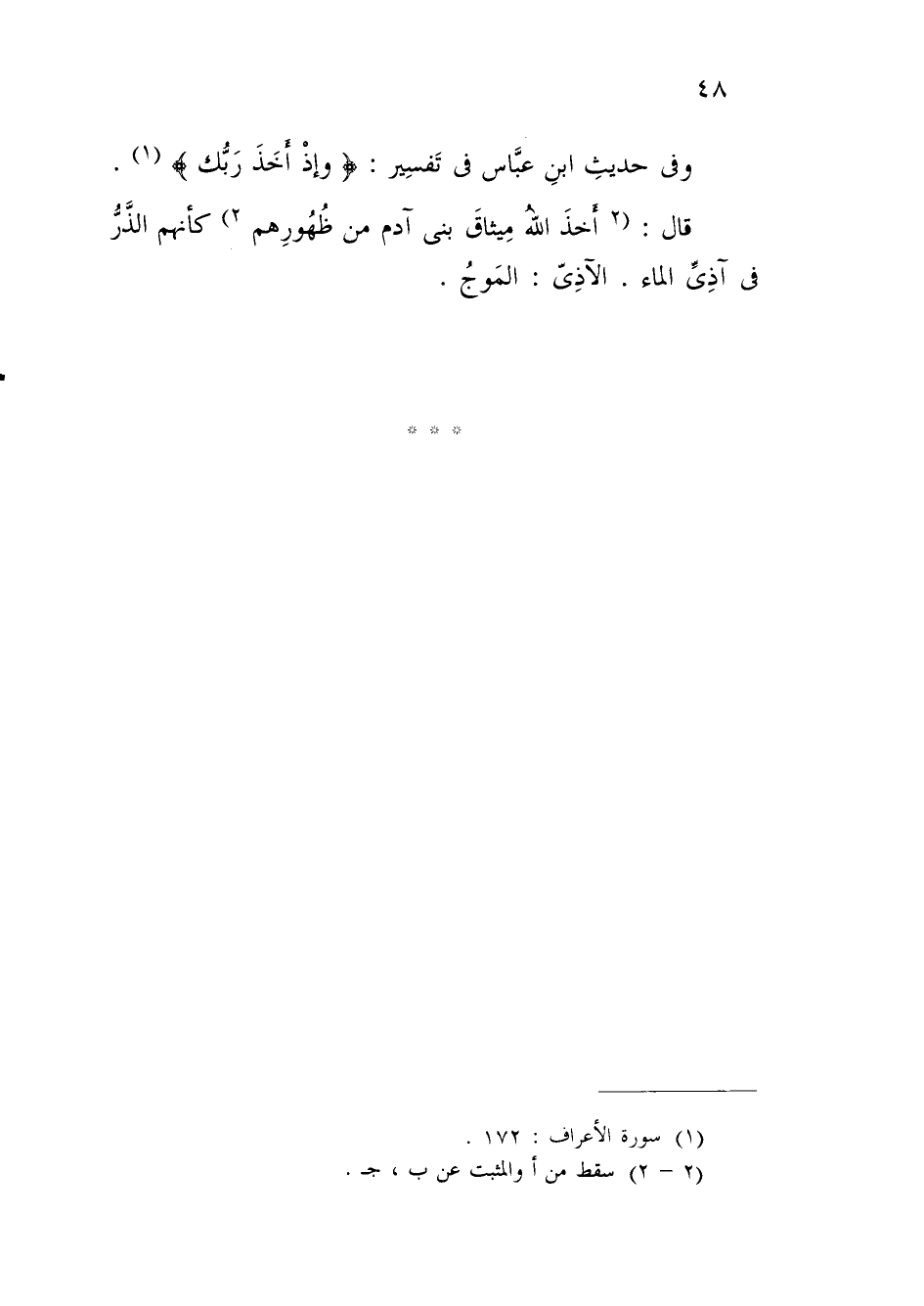 قال: (2 أَخذَ اللهُ مِيثاقَ بنى آدم من ظُهُورِهم 2) كأنهم الذَّرُّ في آذِىِّ الماء. الآذِىّ: المَوجُ.