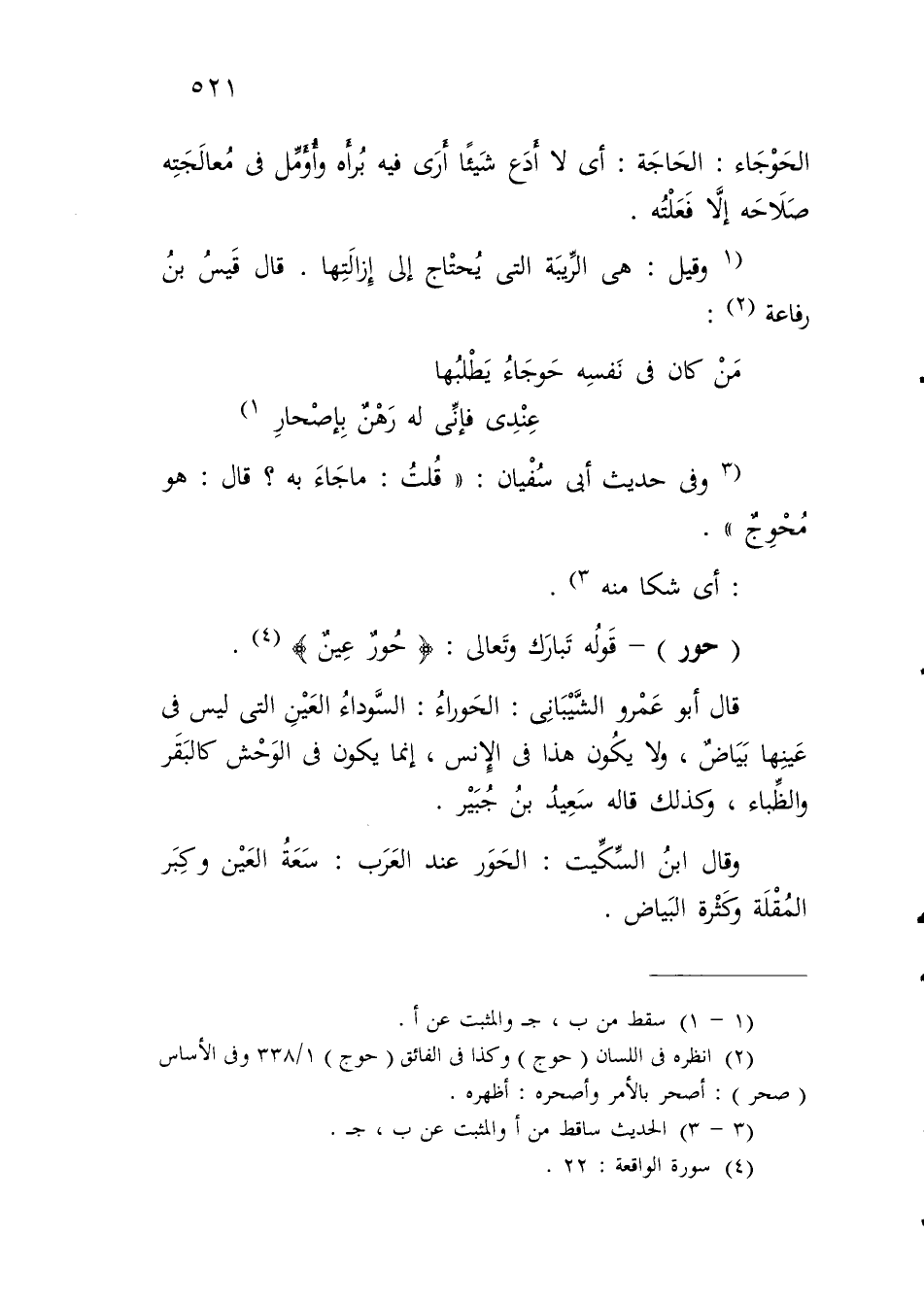 قال أبو عَمْرو الشَّيْبَانِى: الحَوراءُ: السَّوداءُ العَيْنِ التي ليس في عَينِها بَيَاضٌ، ولا يكُون هذا في الإِنس، إنما يكون في الوَحْش كالبَقَر والظِّباء، وكذلك قاله سَعِيدُ بنُ جُبَيْر.