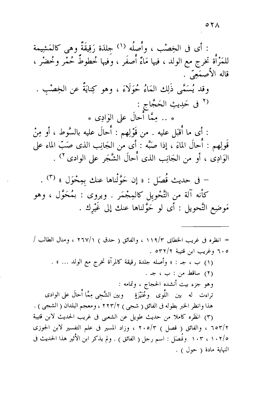 (¬3) انظره كاملا من حديث طويل عن الشعبى في غريب الحديث لابن قتيبة 2/ 653، والفائق (قصل) 3/ 205، وزاد المسير في علم التفسير لابن الجوزى 5/ 102، 103 وقُصَل: اسم رجل (الفائق). ولم يذكر ابن الأثير هذا الحديث في النهاية مادة (حول).