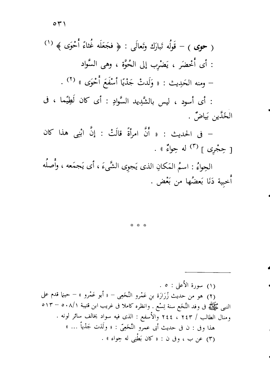 (حوى) - قَولُه تَبارَك وتَعالَى: {فجَعَلَه غُثاءً أحْوَى} (¬1)