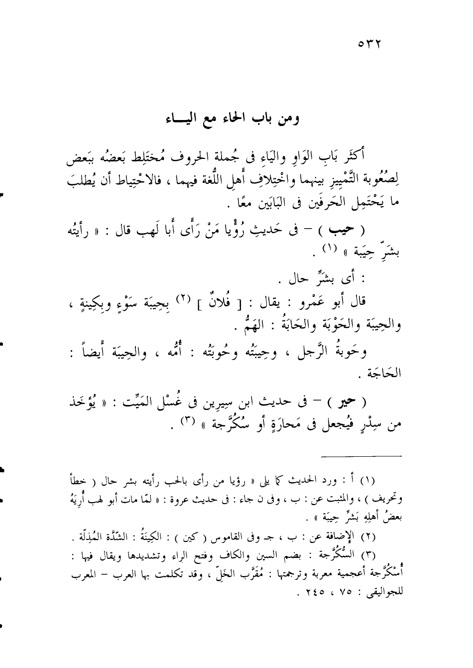 أكثَر بَابِ الوَاوِ واليَاءِ في جُملة الحروف مُختَلِط بَعضُه ببَعض لِصُعُوبة التَّمْيِيزِ بينهما واخْتِلافِ أَهلِ اللُّغة فيهما، فالاحْتِياط أن يُطلبَ ما يَحْتَمِل الحَرفَين في البَابَين معًا.