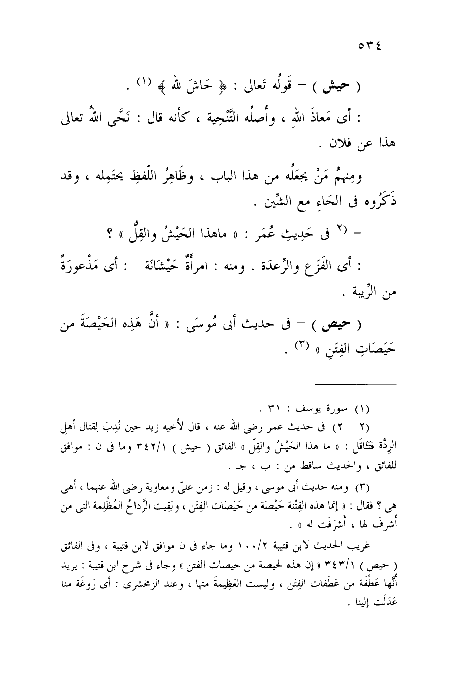 غريب الحديث لابن قتيبة 2/ 100 وما جاء في ن موافق لابن قتيبة، وفي الفائق (حيص) 1/ 343 "إن هذه لحيصة من حيصات الفتن" وجاء في شرح ابن قتيبة: يريد أَنَّها عَطْفَة من عَطَفات الفِتَن، وليست العَظِيمةَ منها، وعند الزمخشرى: أي رَوغَة منا عَدَلَت إلينا.