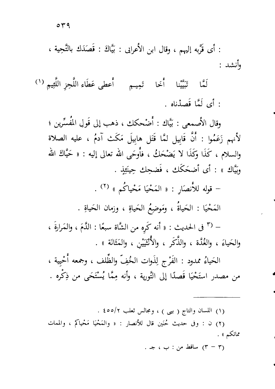 وقال الأصمعى: بَيَّاك: أَضْحكك، ذهب إلى قَولِ المفُسِّرين؛ لأنهم زَعَمُوا: أَنَّ قَابِيل لمَّا قَتَل هابِيلَ مَكَث آدمُ، عليه الصلاة والسلام، كَذَا وكَذَا لا يَضْحَكُ، فأَوحَى الله تعالى إليه: "حَيَّاكَ الله وبَيَّاك": أي أضحَكَك، فَضحِك حِينَئِذٍ.