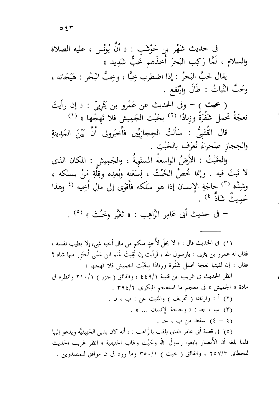 (¬2) في الحديث قال: "لا يحلّ لأَحدٍ منكم من مال أخيه شىء إلا بطيب نفسه، فقال له عمرو بن يثربى: يا رسول الله، أرأيت إن لَقِيتُ غَنَم ابن عَمِّى أَجتَزِر منها شاة؟ فقال: إن لقيتها نعجة تحمل شَفْرة وزِنادًا بِخَبْت الجميش فلا تَهجها"