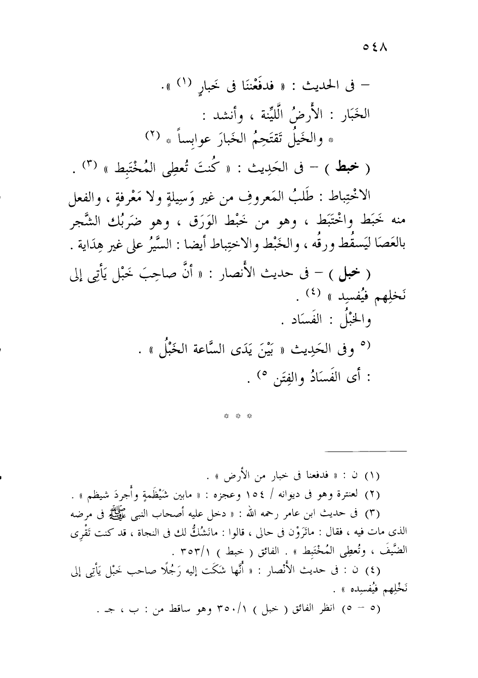 (¬4) ن: في حديث الأَنْصار: "أَنَّها شَكَت إليه رَجُلًا صاحب خَبْل يَأتِى إلى نَخْلِهم فيُفسِده".