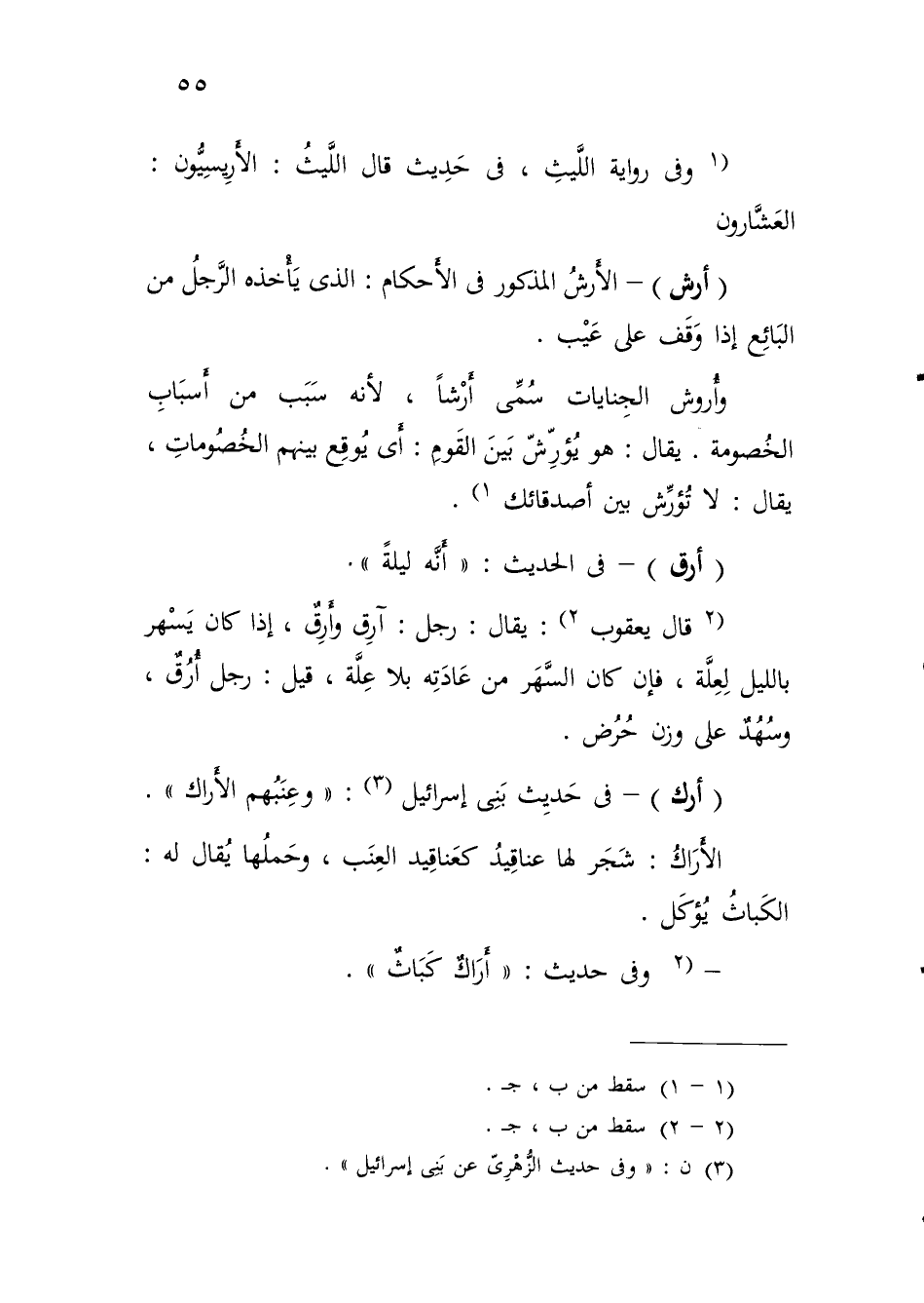 (2 قال يعقوب 2): يقال: رجل: آرِق وأَرِقٌ، إذا كان يَسْهر بالليل لِعِلَّة، فإن كان السَّهَر من عَادَتِه بلا عِلَّة، قيل: رجل أُرُقٌ، وسُهُدٌ على وزن حُرُض.