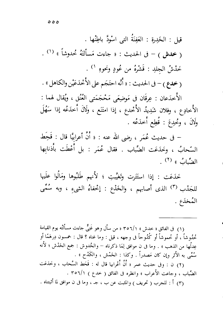 (¬1) في الفائق "خدش" 1/ 356 "من سأل وهو غَنِيٌّ جاءت مسألتُه يوم القيامة خُدُوشاً، أو خُموشاً أو كُدُوحاً في وجهه، قيل: وما غناه؟ قال: خمسون دِرهَمًا أو عِدلُها من الذهب". وما في ن موافق لِمَا ذكرناه - والخُدوش: جمع الخَدْش؛ لأنه سُمِّي به الأثر وإن كان مَصدراً. وكذا: الخَمْش، والكَدْح".