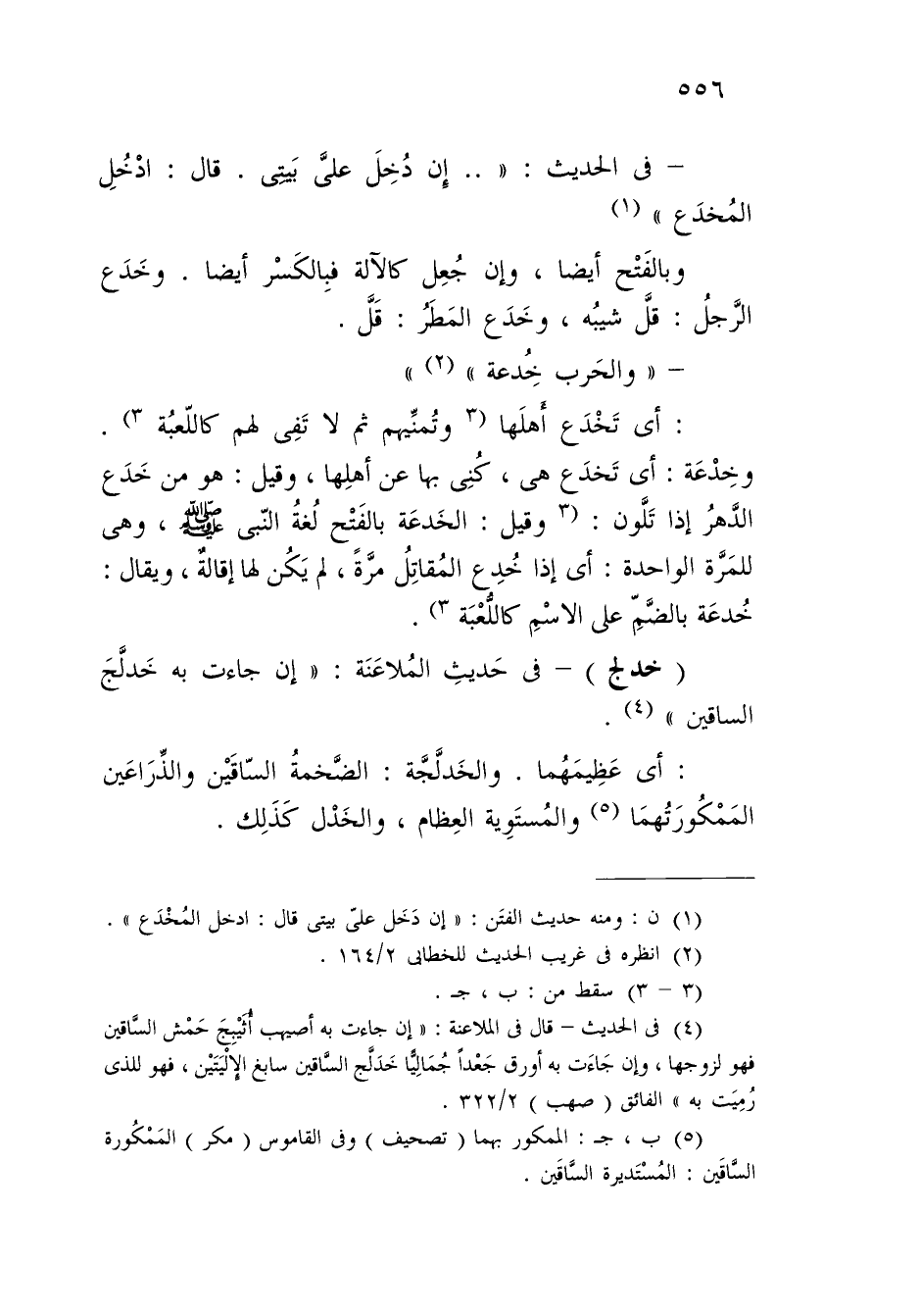 (¬1) ن: ومنه حديث الفتَن: "إن دَخَل عليّ بيتي قال: ادخل المُخْدَع".
