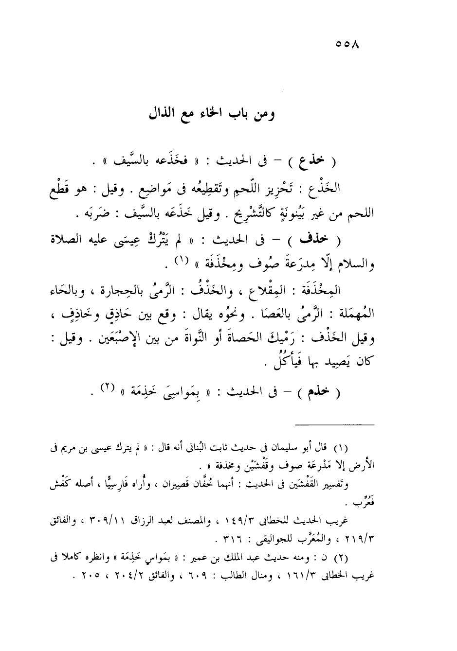 (¬2) ن: ومنه حديث عبد الملك بن عمير: "بمَواسٍ خَذِمَة" وانظره كاملًا في غريب الخطابي 3/ 161، ومنال الطالب: 609، والفائق 2/ 204، 205.