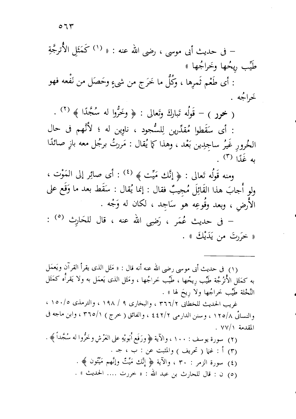 غريب الحديثَ للخطابي 2/ 366، والبخارى 9/ 198، والتِّرمذيّ 5/ 150، والنسائي 8/ 125، وسنن الدارمي 2/ 442، والفائق (خرج) 1/ 365، وابن ماجه في المقدمة 1/ 77.