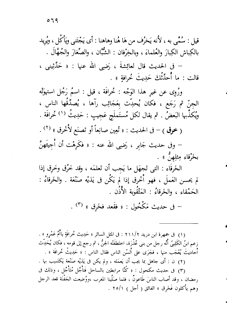 (¬1) في جمهرة ابن دريد 2/ 211: في المثل السائر "حَدِيث خُرافَةٍ يَا أُمَّ عَمْرٍو". زعم ابنُ الكَلبِيّ أَنَه رجل من بنى عُذْرَة، اختَطفَتْه الجنُّ، ثم رجع إلى قومه، فكان يُحَدِّث أَحاديثَ يُعْجَب منها، فجَرَى على أَلسُن النَّاس فقال النَّاس: "حَدِيث خُرافَة".