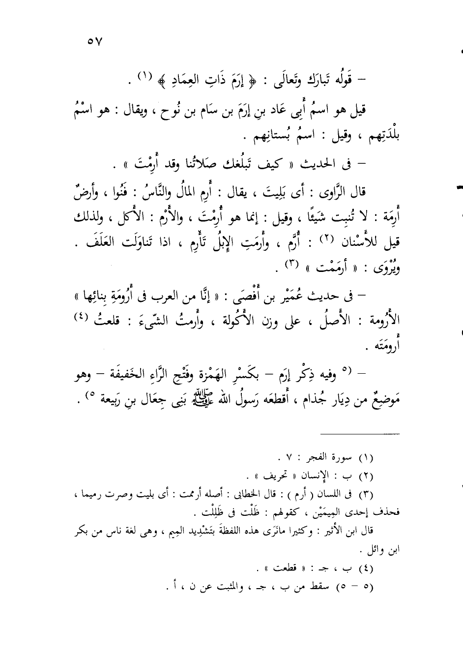 (5 وفيه ذِكْر إرَم - بكَسْرِ الهَمْزة وفَتْحِ الرَّاءِ الخَفيفَة - وهو مَوضِعٌ من دِيار جُذام، أقطعَه رَسولُ الله - صلى الله عليه وسلم - بَنِى جِعال بنِ رَبيعة 5).