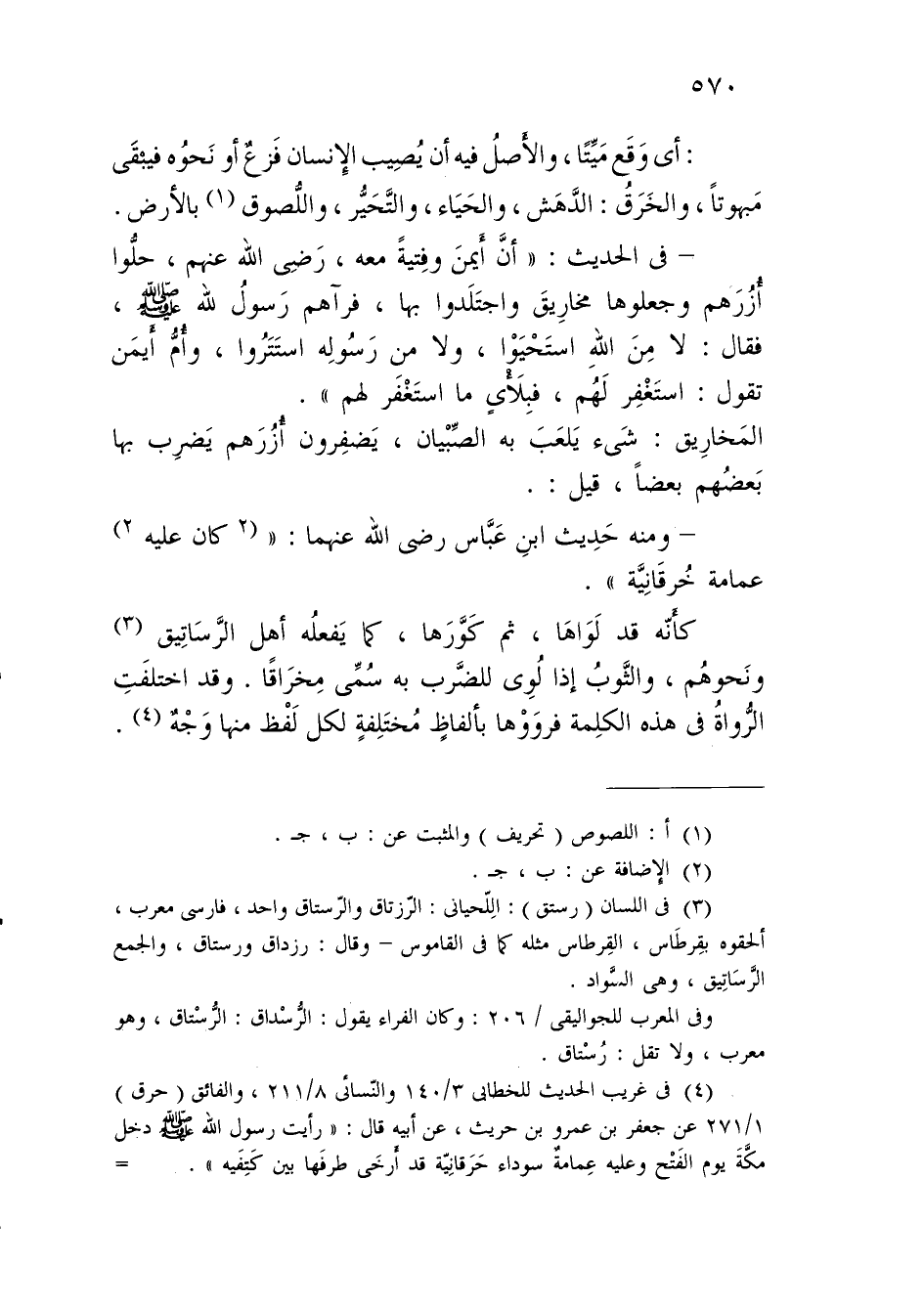 (¬4) في غريب الحديث للخطابي 3/ 140 والنّسائي 8/ 211، والفائق (حرق) 1/ 271 عن جعفر بن عمرو بن حريث، عن أَبيه قال: "رأيت رسول الله - صلى الله عليه وسلم - دخل مكَّةَ يوم الفَتْح وعليه عِمامةٌ سوداء حَرَقانِيّة قد أَرخَى طرفَها بين كَتِفَيه". =