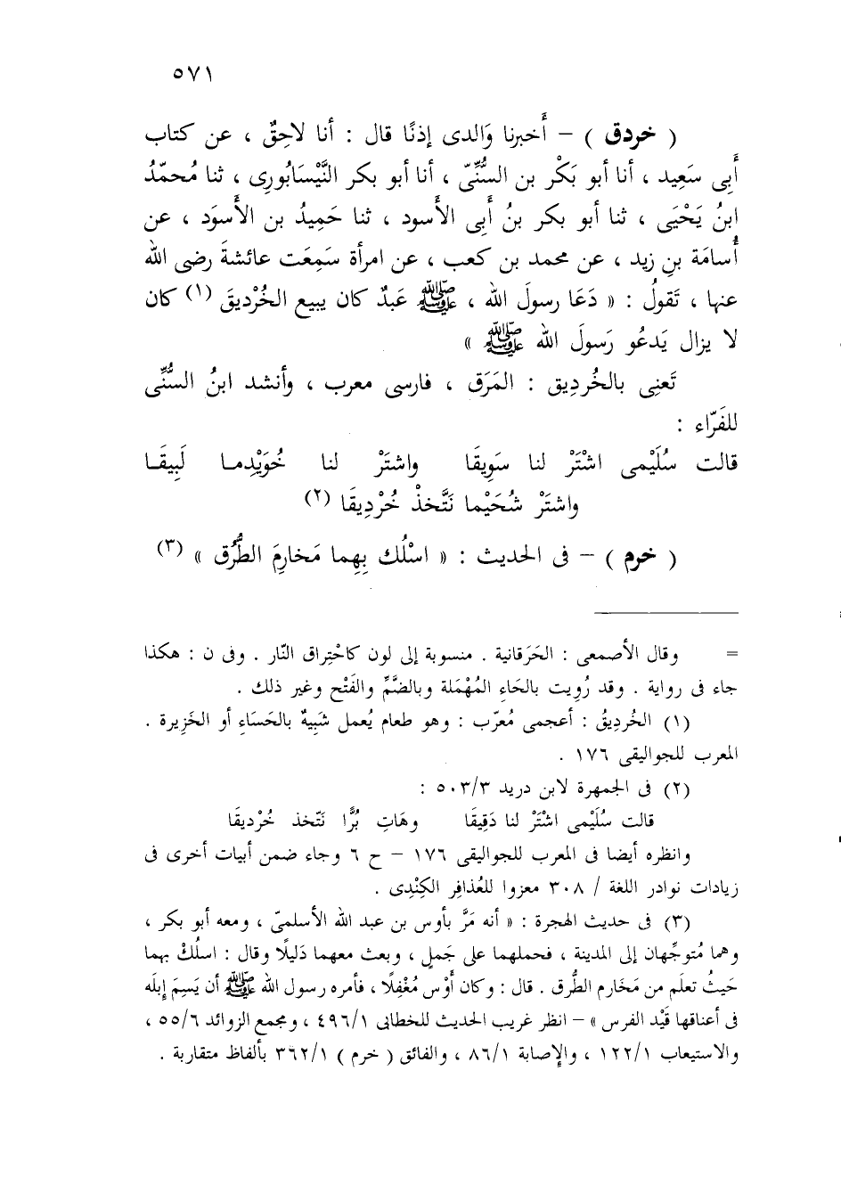 (خردق) - أَخبرنا وَالدي إذنًا قال: أنا لاحِقٌ، عن كتاب أَبِي سَعِيد، أنا أبو بَكْر بن السُّنِّيّ، أنا أبو بكر النَّيْسَابُورِي، ثنا مُحمّدُ ابنُ يَحْيَى، ثنا أبو بكر بنُ أَبِي الأسود، ثنا حَمِيدُ بن الأَسوَد، عن أُسامَة بنِ زيد، عن مُحَمَّد بن كعب، عن امرأة سَمِعَت عائشةَ رضي الله عنها، تَقولُ: "دَعَا رسولَ الله، - صلى الله عليه وسلم - عَبدٌ كان يبيع الخُرْديقَ (¬1) كان لا يزال يَدعُو رَسولَ الله - صلى الله عليه وسلم - "