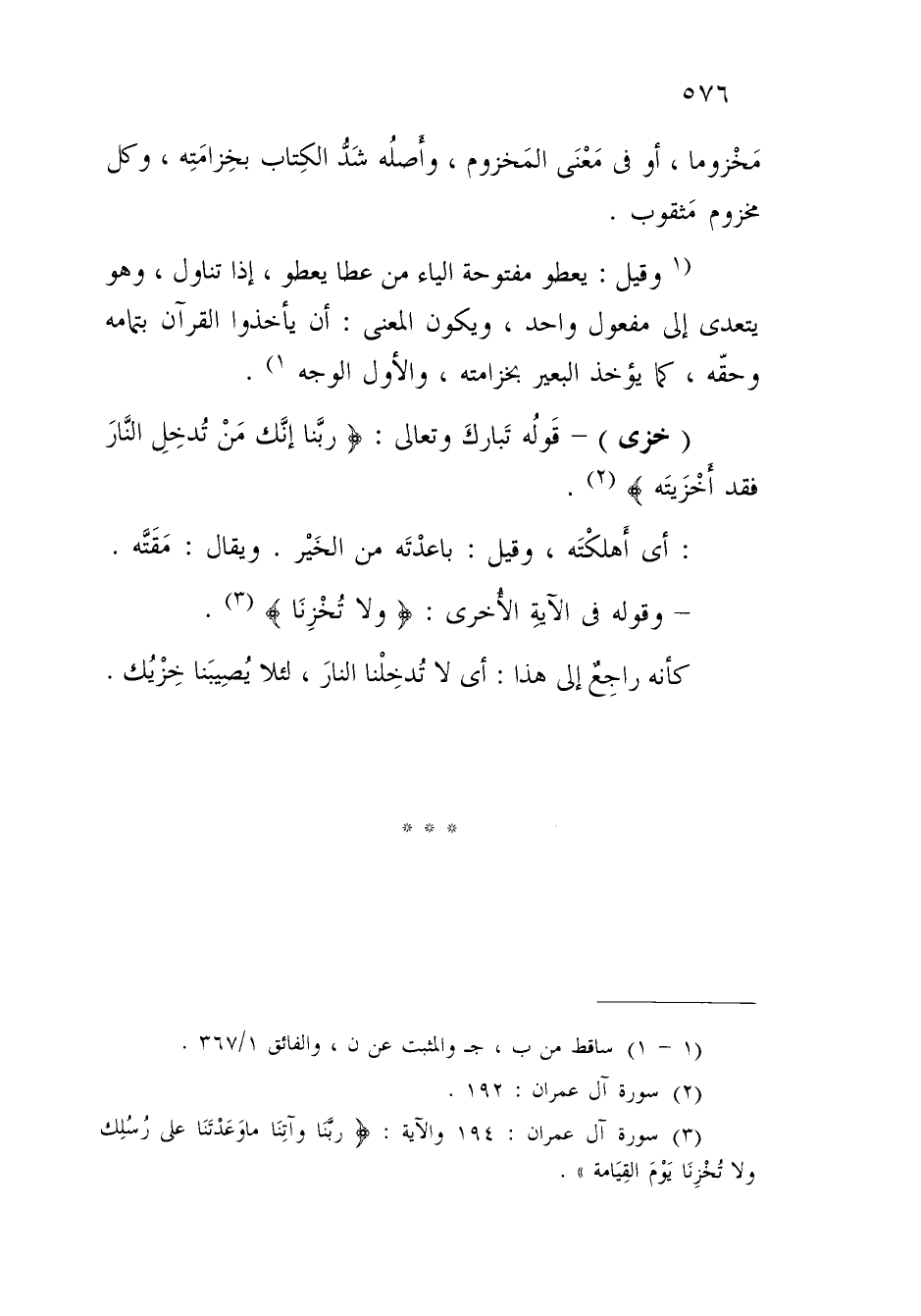 (خزى) - قَولُه تَباركَ وتعالى: {رَبَّنَا إِنَّكَ مَنْ تُدْخِلِ النَّارَ فَقَدْ أَخْزَيْتَهُ} (¬2).
