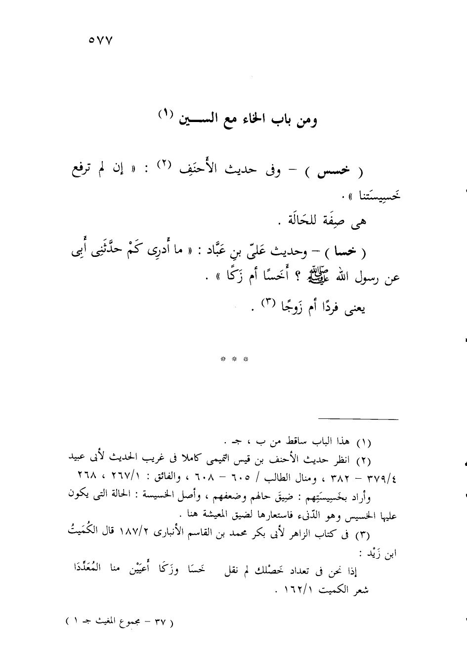 (¬2) انظر حديث الأحنف بن قيس التميمي كاملًا في غريب الحديث لأبي عبيد 4/ 379 - 382، ومنال الطالب / 605 - 608، والفائق: 1/ 267، 268