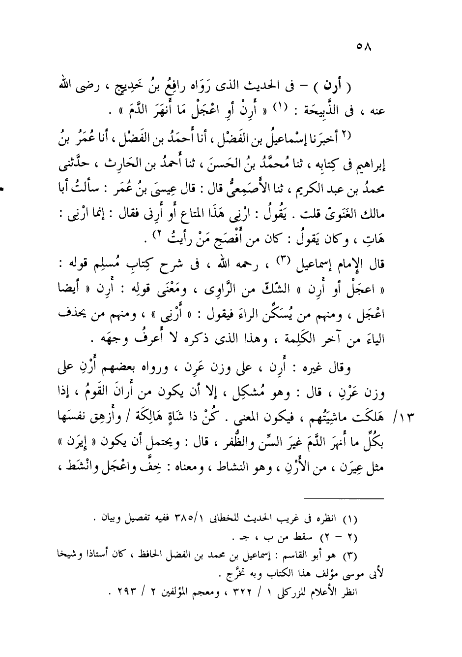 قال الِإمام إسماعيل (¬3)، رحمه الله، في شرح كِتابِ مُسلِم قوله: "اعجَلْ أو أَرِن" الشّكّ من الرّاوِى، ومَعْنَى قولِه: أَرِن "أيضا اعْجَل، ومنهم من يُسَكِّن الراءَ فيقول: "أَرْنِى"، ومنهم من يحذف الياءَ من آخر الكَلِمة، وهذا الذي ذكره لا أَعرفُ وجهَه.