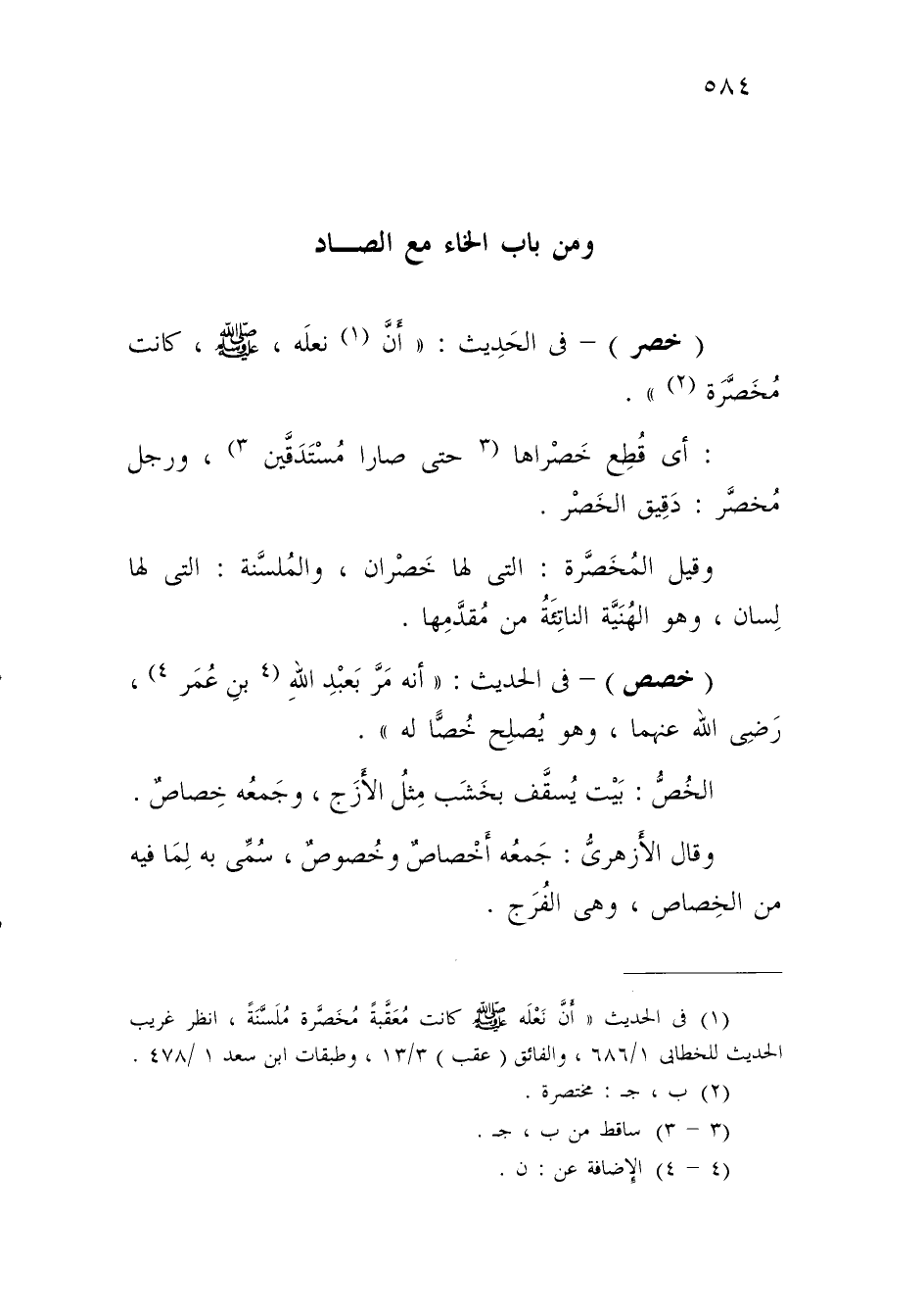 (¬1) في الحديث "أَنَّ نَعْلَه - صلى الله عليه وسلم - كانت مُعَقَّبةً مُخَصَّرة مُلَسَّنَةً، انظر غريب الحديث للخطابي 1/ 686، والفائق (عقب) 3/ 13، وطبقات ابن سعد 1/ 478.