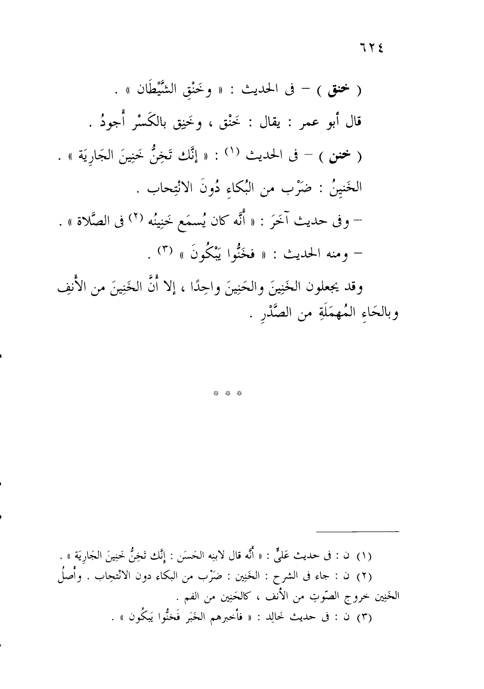 (¬2) ن: جاء في الشرح: الخَنِين: ضَرْب من البكاء دون الانْتِحاب. وأَصلُ الخَنِين خروج الصّوتِ من الأنف، كالحَنِين من الفم.