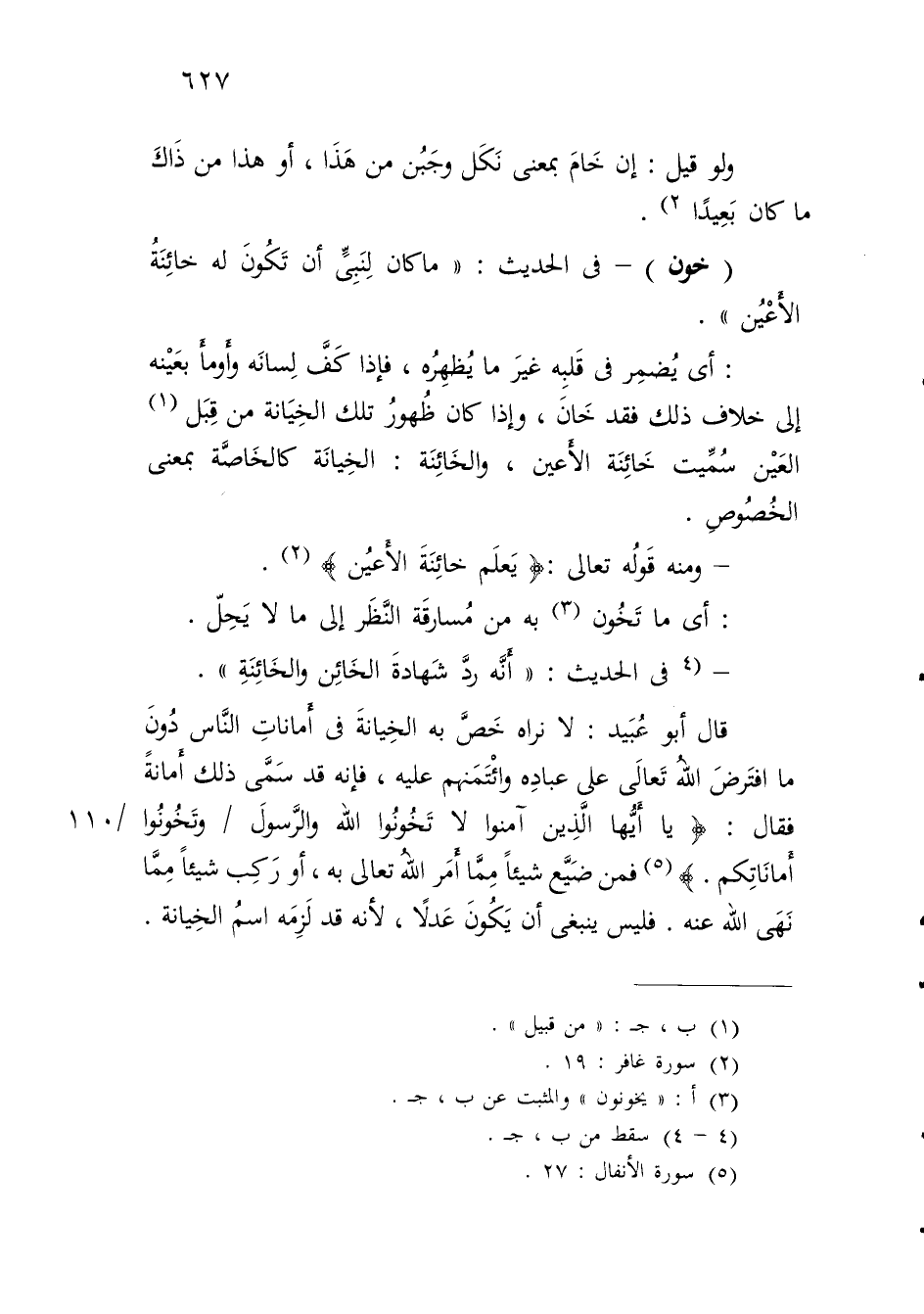 قال أبو عُبَيد: لا نراه خَصَّ به الخِيانةَ في أَماناتِ النَّاس دُونَ ما افتَرضَ اللهُ تَعالَى على عبادِه وائْتَمَنهم عليه، فإنَّه قد سَمَّى ذلك أَمانةً فقال: {يَاأَيُّهَا الَّذِينَ آمَنُوا لَا تَخُونُوا اللَّهَ وَالرَّسُولَ وَتَخُونُوا أَمَانَاتِكُمْ} (¬5) فمن ضَيَّع شيئًا مِمَّا أَمَر اللهُ تعالى به، أو رَكِب شيئًا مِمَّا نَهَى الله عنه. فليس ينبغي أن يَكُونَ عَدلًا، لأنه قد لَزِمَه اسمُ الخِيانة.