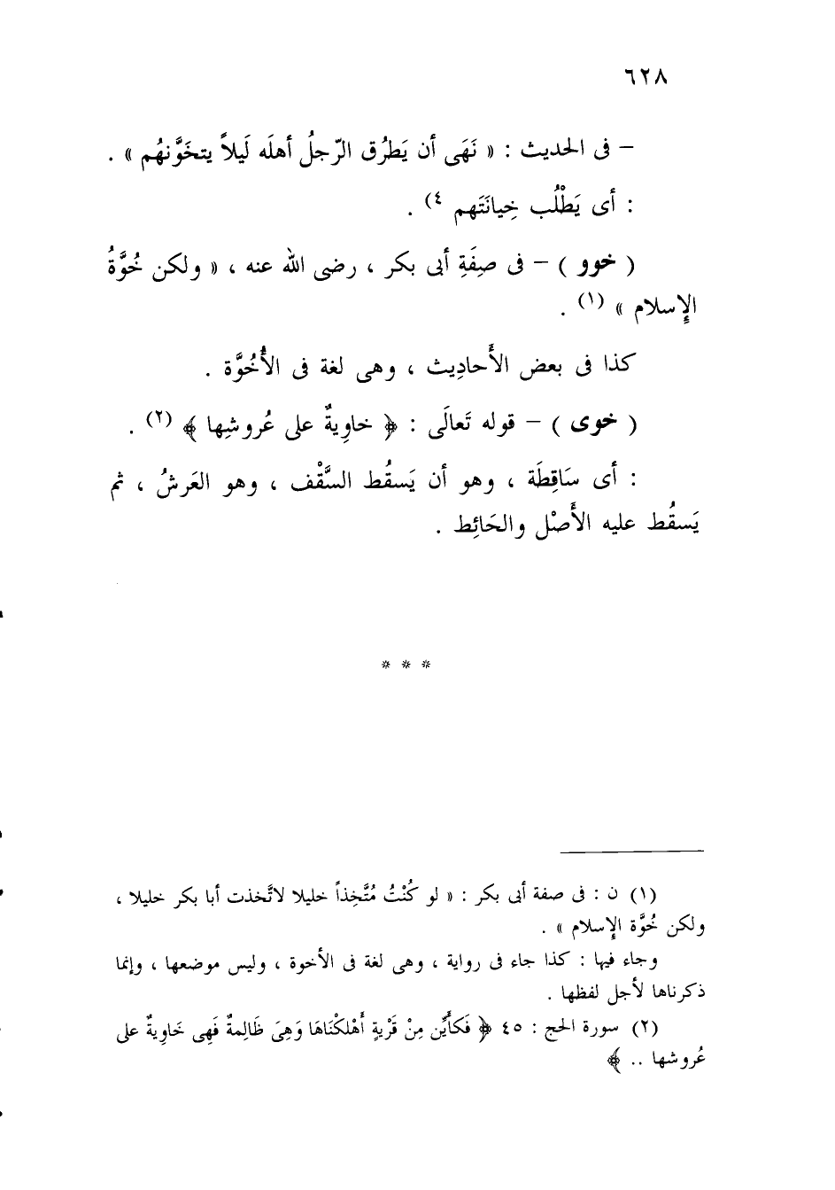 (خوى) - قوله تَعالَى: {خَاوِيَةٌ عَلَى عُرُوشِهَا} (¬2).