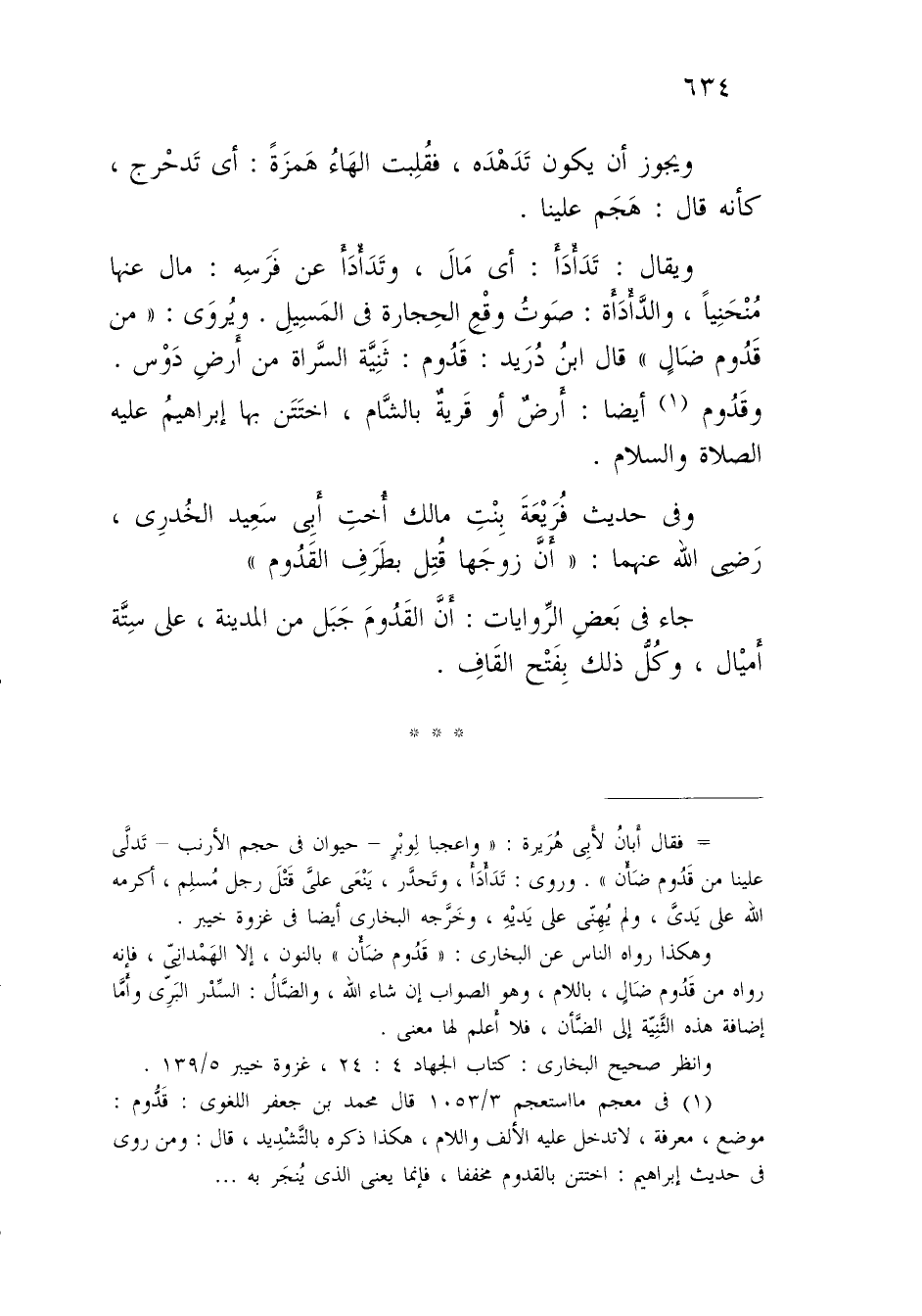 ويقال: تَدَأْدَأَ: أي مَالَ، وتَدَأْدَأَ عن فَرَسِه: مال عنها مُنْحَنِيًا، والدَّأْدَأَة: صَوتُ وقْعِ الحِجارة في المَسِيلِ. ويُروَى: "من قَدُوم ضَالٍ" قال ابنُ دُرَيد: قَدُوم: ثَنِيَّة السَّراة من أَرضِ دَوْس. وقَدُوم (¬1) أَيضًا: أَرضٌ أو قَريةٌ بالشَّام، اختَتَن بها إبراهيمُ عليه الصلاة والسلام.