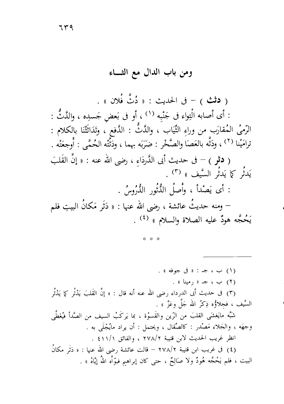 (¬3) في حديث أبي الدَّرداء رضي الله عنه أَنَّه قال: "إنَّ القَلبَ يَدْثُر كما يَدْثُر السَّيف، فجِلاؤُه ذِكرُ الله جَلَّ وعَزَّ".