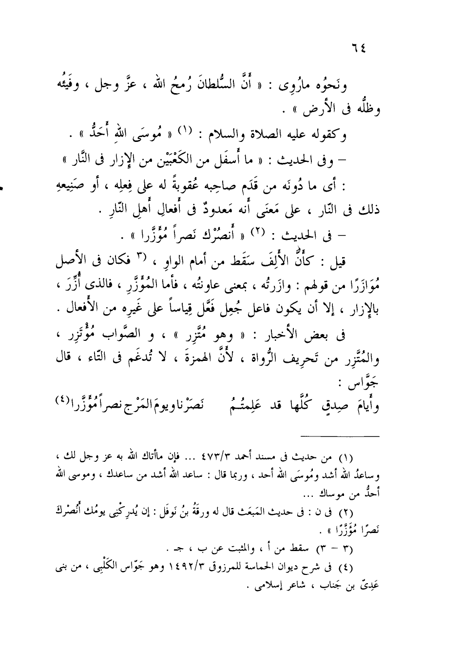 قيل: كأنَّ الأَلِفَ سَقَط من أمام الواوِ، (3 فكان في الأصل مُوازَرًا من قولهم: وازَرتُه، بمعنى عاونتُه، فأما المُؤَزَّرِ، فالذي أُزِّرَ، بالِإزار، إلا أن يكون فاعل جُعِل فَعَّل قِياسًا على غَيرِه من الأَفعال.