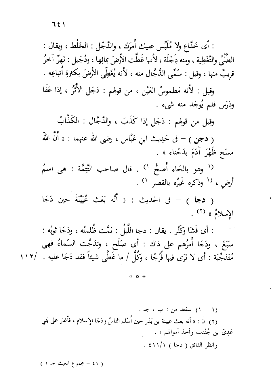 (دجا) - في الحديث: "أَنَّه بَعَث عُيَيْنَةَ حين دَجَا الِإسلامُ" (¬2).