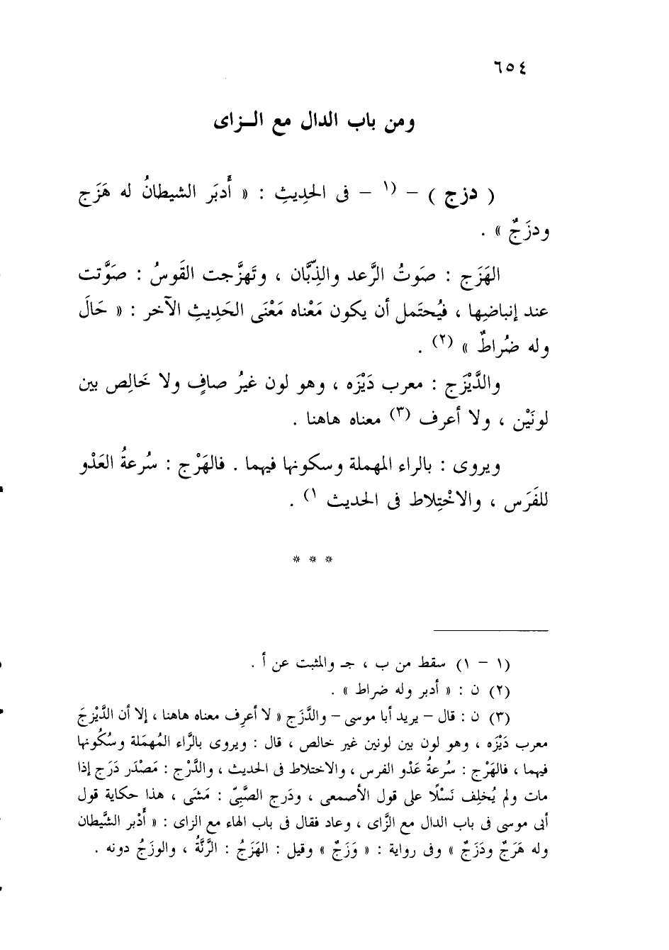 (¬3) ن: قال - يريد أبا موسى - والدَّزَج "لا أعرِف معناه ها هنا، إلا أن الديْزجَ معرب دَيْزَه، وهو لون بين لونين غير خالص، قال: ويروى بالرَّاء المُهمَلة وسُكُونها فيهما، فالهَرْج: سُرعةُ عَدْو الفرس، والاختلاط في الحديث، والدَّرْج: مَصْدَر دَرَج إذا مات ولم يُخلِف نَسْلًا على قول الأصمعيُّ، ودَرج الصَّبِىّ: مَشىَ، هذا حكاية قول أبي موسى في باب الدال مع الزَّاى، وعاد فقال في باب الهاء مع الزاى: "أدبر الشَّيطان وله هَرَجٌ ودَزَجٌ" وفي رواية: "وَزَجٌ" وقيل: الهَزَجُ: الرَّنَّةُ، والوزَجُ دونه.