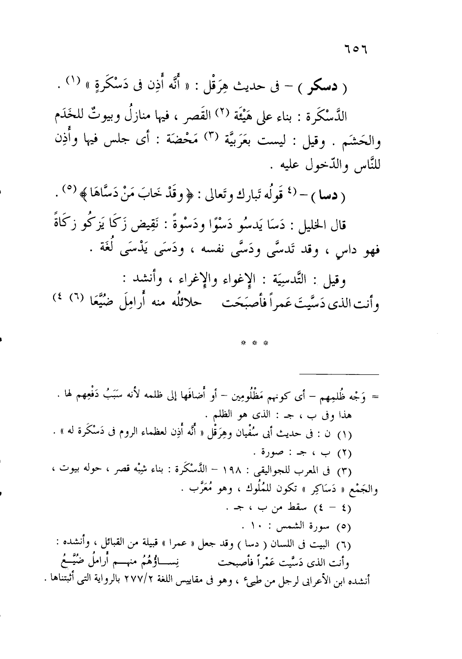 (¬3) في العرب للجواليقى: 198 - الدَّسْكَرة: بناء شِبْه قصر، حوله بِيوت، والجَمْع "دسَاكِر" تكون للمُلُوك، وهو مُعَرَّب.