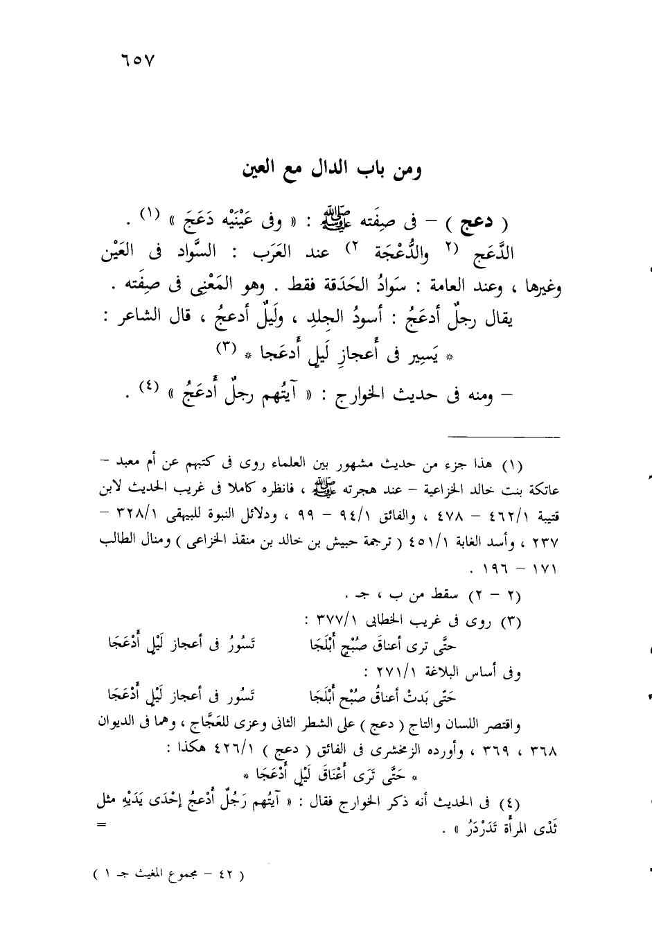 واقتصر اللسان والتاج (دعج) على الشطر الثاني وعزى للعَجَّاج، وهما في الديوان 368، 369، وأورده الزمخشرى في الفائق (دعج) 1/ 426 هكذا: