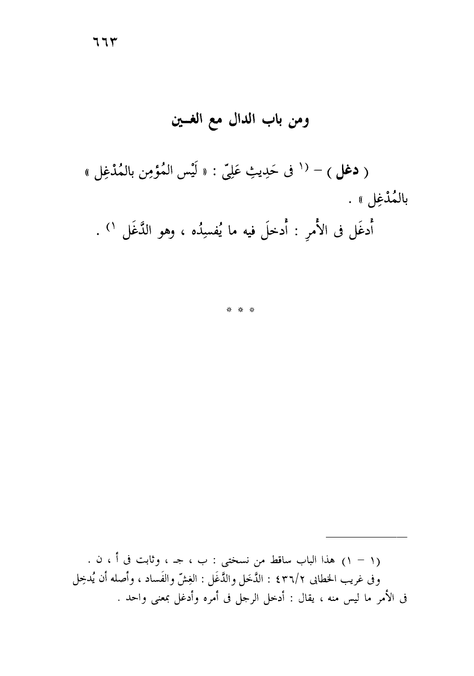 (دغل) - (1 في حَدِيثِ عَلِىّ: "لَيْس المُؤمِن بالمُدْغِل" بالمُدْغِل".