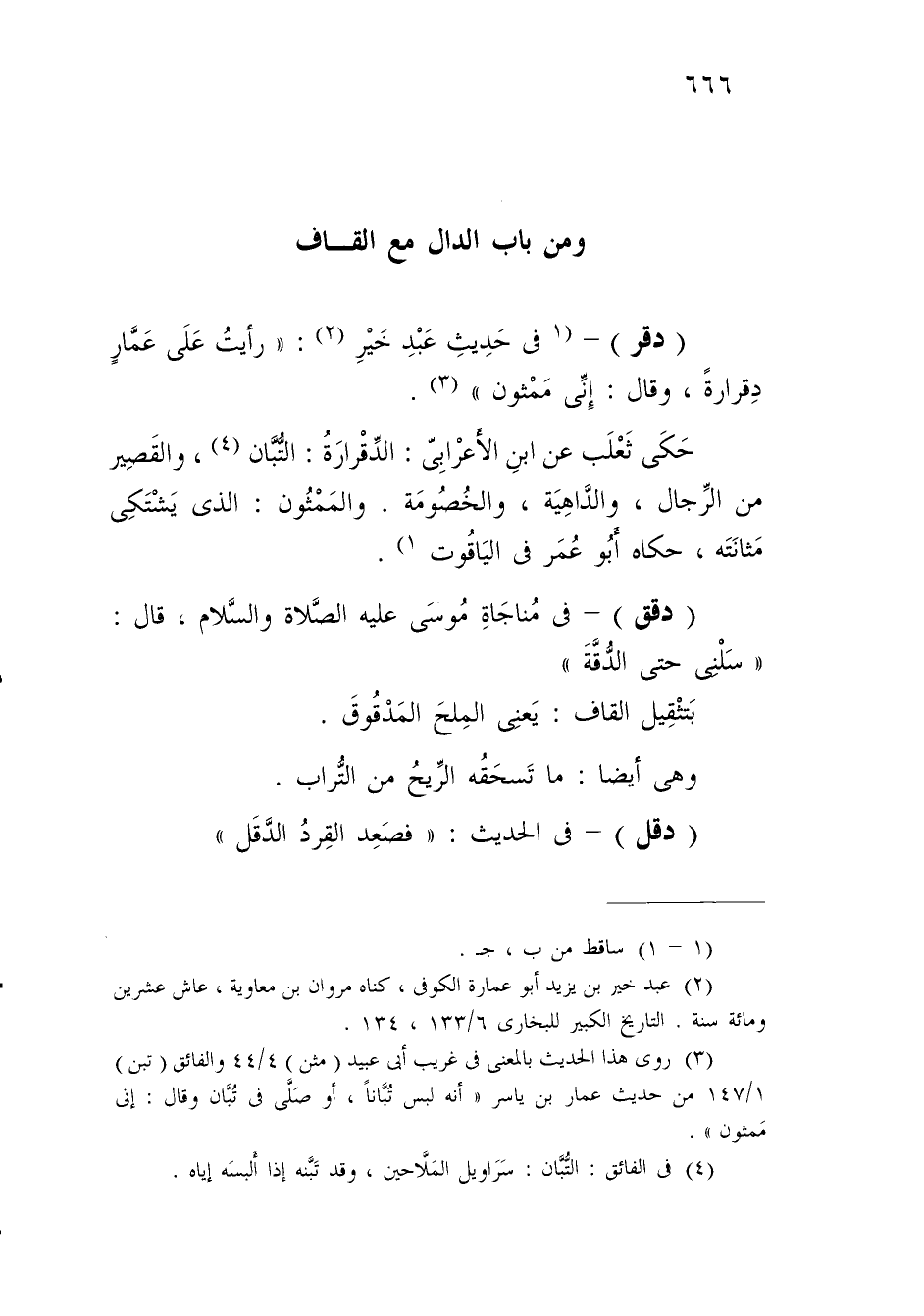 حَكَى ثَعْلَب عن ابنِ الأَعرْابِىّ: الدِّقْرارَةُ: التُّبَّان (¬4)، والقَصِير من الرِّجال، والدَّاهِيَة، والخُصُومَة. والمَمْثُون: الذي يَشْتَكِى مَثانَتَه، حكاه أبو عُمَر في اليَاقُوت 1).