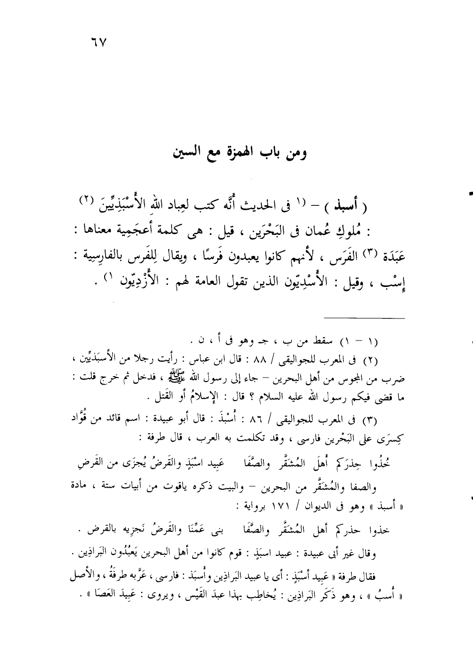(¬3) في العرب للجواليقى / 86: أَسْبذَ: قال أبو عبيدة: اسم قائد من قُوَّاد كِسرَى على البَحْرين فارسى، وقد تكلمت به العرب، قال طرفة: